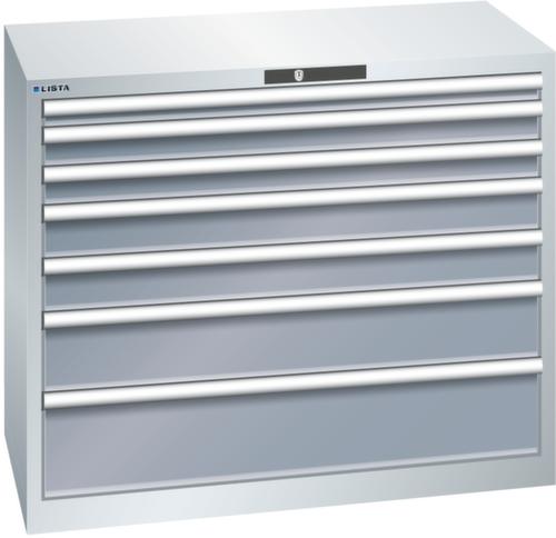 "longDescription": "LISTA Schubladenschrank, Lista Einheit: 54x27E, BxTxH: 1023x572x850mm, Schubladen-Nutzfläche BxT: 918x459mm, Anzahl Schubladen: 7, Anzahl Fronthöhen (Tragkraft): 1x50mm (75kg), 2x75mm (200kg), 2x100mm (200kg), 1x150mm (200kg), 1x200mm (200kg), Schliessart: Code Lock, elektronisches Zahlenschloss mit 10 Ziffern für 4- bis 6-stellige Codes, bis 100 Codes, Farbe Gehäuse: Lichtgrau RAL 7035, Farbe Schubladen: Grau metallic NCS S 6502-B. Höchste Stabilität: Gehäuse bis 4t belastbar, Schubladen mit 75 oder 200 kg Tragkraft. Maximale Ausnutzung dank Vollauszug und optimaler Mantelhöhe der Schubladen. Exzellente Schutzeigenschaften gegen Schmutz, Flüssigkeiten und mechanische Beanspruchung durch geschlossenes Gehäuse mit schlag- und abriebfester Oberfläche. Überzeugende Sicherheit: Aushebesicherung gegen Herausfallen der Schubladen und Einzelschubladensperre als Kippschutz. Korrosionsschutz durch Elektrophorese-Tauchlackierung und umweltfreundlichen Pulverlack. Optimale Ordnung und Organisation dank speziellem LISTA-Einteilungsmaterial für jeden Zweck und gelochter, geschlitzter Schubladen. Professionelle Beschriftung mit Beschriftungssoftware LISTA Script und hochklappbarer Griffleiste zum Einlegen der Etiketten. Perfekte Laufruhe durch traversenlos geführten Differenzialauszug. Flexible Anpassungsmöglichkeiten durch vorperforierte Löcher für Tischplatten (Punchout), Rollen, Schubladen, Schliesssysteme für einfaches Um- und Nachrüsten<br>",