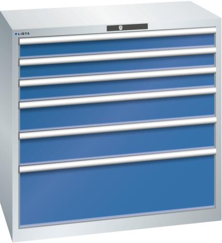 "longDescription": "LISTA Schubladenschrank, Lista Einheit: 54x27E, BxTxH: 1023x572x1000mm, Schubladen-Nutzfläche BxT: 918x459mm, Anzahl Schubladen: 6, Anzahl Fronthöhen (Tragkraft): 3x100mm (75kg), 2x150mm (75kg), 1x300mm (200kg), Schliessart: Key Lock, Standard-Schliessung mit Wechselyzlinder inkl. 2 Schlüsseln mit Schlüsselnummer, Farbe Gehäuse: Lichtgrau RAL 7035, Farbe Schubladen: Signalblau RAL 5005. Höchste Stabilität: Gehäuse bis 4t belastbar, Schubladen mit 75 oder 200 kg Tragkraft. Maximale Ausnutzung dank Vollauszug und optimaler Mantelhöhe der Schubladen. Exzellente Schutzeigenschaften gegen Schmutz, Flüssigkeiten und mechanische Beanspruchung durch geschlossenes Gehäuse mit schlag- und abriebfester Oberfläche. Überzeugende Sicherheit: Aushebesicherung gegen Herausfallen der Schubladen und Einzelschubladensperre als Kippschutz. Korrosionsschutz durch Elektrophorese-Tauchlackierung und umweltfreundlichen Pulverlack. Optimale Ordnung und Organisation dank speziellem LISTA-Einteilungsmaterial für jeden Zweck und gelochter, geschlitzter Schubladen. Professionelle Beschriftung mit Beschriftungssoftware LISTA Script und hochklappbarer Griffleiste zum Einlegen der Etiketten. Perfekte Laufruhe durch traversenlos geführten Differenzialauszug. Flexible Anpassungsmöglichkeiten durch vorperforierte Löcher für Tischplatten (Punchout), Rollen, Schubladen, Schliesssysteme für einfaches Um- und Nachrüsten<br>",