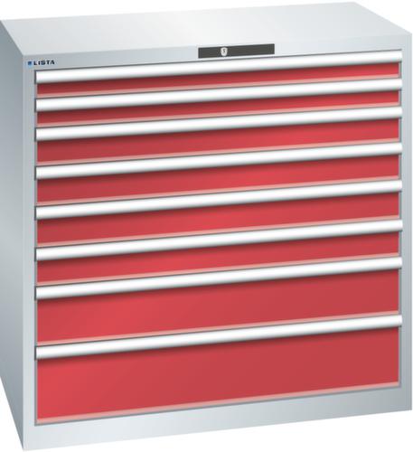 "longDescription": "LISTA Schubladenschrank, Lista Einheit: 54x27E, BxTxH: 1023x572x1000mm, Schubladen-Nutzfläche BxT: 918x459mm, Anzahl Schubladen: 8, Anzahl Fronthöhen (Tragkraft): 2x75mm (75kg), 4x100mm (75kg), 1x150mm (75kg), 1x200mm (75kg), Schliessart: Code Lock, elektronisches Zahlenschloss mit 10 Ziffern für 4- bis 6-stellige Codes, bis 100 Codes, Farbe Gehäuse: Lichtgrau RAL 7035, Farbe Schubladen: Rubinrot RAL 3003. Höchste Stabilität: Gehäuse bis 4t belastbar, Schubladen mit 75 oder 200 kg Tragkraft. Maximale Ausnutzung dank Vollauszug und optimaler Mantelhöhe der Schubladen. Exzellente Schutzeigenschaften gegen Schmutz, Flüssigkeiten und mechanische Beanspruchung durch geschlossenes Gehäuse mit schlag- und abriebfester Oberfläche. Überzeugende Sicherheit: Aushebesicherung gegen Herausfallen der Schubladen und Einzelschubladensperre als Kippschutz. Korrosionsschutz durch Elektrophorese-Tauchlackierung und umweltfreundlichen Pulverlack. Optimale Ordnung und Organisation dank speziellem LISTA-Einteilungsmaterial für jeden Zweck und gelochter, geschlitzter Schubladen. Professionelle Beschriftung mit Beschriftungssoftware LISTA Script und hochklappbarer Griffleiste zum Einlegen der Etiketten. Perfekte Laufruhe durch traversenlos geführten Differenzialauszug. Flexible Anpassungsmöglichkeiten durch vorperforierte Löcher für Tischplatten (Punchout), Rollen, Schubladen, Schliesssysteme für einfaches Um- und Nachrüsten<br>",