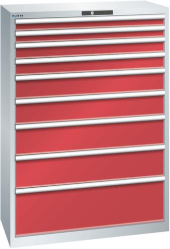"longDescription": "LISTA Schubladenschrank, Lista Einheit: 54x27E, BxTxH: 1023x572x1450mm, Schubladen-Nutzfläche BxT: 918x459mm, Anzahl Schubladen: 9, Anzahl Fronthöhen (Tragkraft): 2x75mm (75kg), 2x100mm (75kg), 2x150mm (75kg), 2x200mm (75kg), 1x300mm (200kg), Schliessart: Code Lock, elektronisches Zahlenschloss mit 10 Ziffern für 4- bis 6-stellige Codes, bis 100 Codes, Farbe Gehäuse: Lichtgrau RAL 7035, Farbe Schubladen: Rubinrot RAL 3003. Höchste Stabilität: Gehäuse bis 4t belastbar, Schubladen mit 75 oder 200 kg Tragkraft. Maximale Ausnutzung dank Vollauszug und optimaler Mantelhöhe der Schubladen. Exzellente Schutzeigenschaften gegen Schmutz, Flüssigkeiten und mechanische Beanspruchung durch geschlossenes Gehäuse mit schlag- und abriebfester Oberfläche. Überzeugende Sicherheit: Aushebesicherung gegen Herausfallen der Schubladen und Einzelschubladensperre als Kippschutz. Korrosionsschutz durch Elektrophorese-Tauchlackierung und umweltfreundlichen Pulverlack. Optimale Ordnung und Organisation dank speziellem LISTA-Einteilungsmaterial für jeden Zweck und gelochter, geschlitzter Schubladen. Professionelle Beschriftung mit Beschriftungssoftware LISTA Script und hochklappbarer Griffleiste zum Einlegen der Etiketten. Perfekte Laufruhe durch traversenlos geführten Differenzialauszug. Flexible Anpassungsmöglichkeiten durch vorperforierte Löcher für Tischplatten (Punchout), Rollen, Schubladen, Schliesssysteme für einfaches Um- und Nachrüsten<br>",