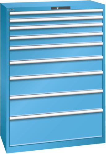 "longDescription": "LISTA Schubladenschrank, Lista Einheit: 54x27E, BxTxH: 1023x572x1450mm, Schubladen-Nutzfläche BxT: 918x459mm, Anzahl Schubladen: 9, Anzahl Fronthöhen (Tragkraft): 2x75mm (200kg), 2x100mm (200kg), 2x150mm (200kg), 2x200mm (200kg), 1x300mm (200kg), Schliessart: Key Lock, Standard-Schliessung mit Wechselyzlinder inkl. 2 Schlüsseln mit Schlüsselnummer, Farbe Gehäuse: Lichtblau RAL 5012, Farbe Schubladen: Lichtblau RAL 5012. Höchste Stabilität: Gehäuse bis 4t belastbar, Schubladen mit 75 oder 200 kg Tragkraft. Maximale Ausnutzung dank Vollauszug und optimaler Mantelhöhe der Schubladen. Exzellente Schutzeigenschaften gegen Schmutz, Flüssigkeiten und mechanische Beanspruchung durch geschlossenes Gehäuse mit schlag- und abriebfester Oberfläche. Überzeugende Sicherheit: Aushebesicherung gegen Herausfallen der Schubladen und Einzelschubladensperre als Kippschutz. Korrosionsschutz durch Elektrophorese-Tauchlackierung und umweltfreundlichen Pulverlack. Optimale Ordnung und Organisation dank speziellem LISTA-Einteilungsmaterial für jeden Zweck und gelochter, geschlitzter Schubladen. Professionelle Beschriftung mit Beschriftungssoftware LISTA Script und hochklappbarer Griffleiste zum Einlegen der Etiketten. Perfekte Laufruhe durch traversenlos geführten Differenzialauszug. Flexible Anpassungsmöglichkeiten durch vorperforierte Löcher für Tischplatten (Punchout), Rollen, Schubladen, Schliesssysteme für einfaches Um- und Nachrüsten<br>",
