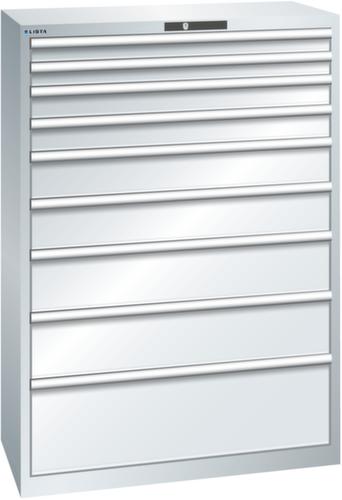 "longDescription": "LISTA Schubladenschrank, Lista Einheit: 54x27E, BxTxH: 1023x572x1450mm, Schubladen-Nutzfläche BxT: 918x459mm, Anzahl Schubladen: 9, Anzahl Fronthöhen (Tragkraft): 2x75mm (200kg), 2x100mm (200kg), 2x150mm (200kg), 2x200mm (200kg), 1x300mm (200kg), Schliessart: Key Lock, Standard-Schliessung mit Wechselyzlinder inkl. 2 Schlüsseln mit Schlüsselnummer, Farbe Gehäuse: Lichtgrau RAL 7035, Farbe Schubladen: Lichtgrau RAL 7035. Höchste Stabilität: Gehäuse bis 4t belastbar, Schubladen mit 75 oder 200 kg Tragkraft. Maximale Ausnutzung dank Vollauszug und optimaler Mantelhöhe der Schubladen. Exzellente Schutzeigenschaften gegen Schmutz, Flüssigkeiten und mechanische Beanspruchung durch geschlossenes Gehäuse mit schlag- und abriebfester Oberfläche. Überzeugende Sicherheit: Aushebesicherung gegen Herausfallen der Schubladen und Einzelschubladensperre als Kippschutz. Korrosionsschutz durch Elektrophorese-Tauchlackierung und umweltfreundlichen Pulverlack. Optimale Ordnung und Organisation dank speziellem LISTA-Einteilungsmaterial für jeden Zweck und gelochter, geschlitzter Schubladen. Professionelle Beschriftung mit Beschriftungssoftware LISTA Script und hochklappbarer Griffleiste zum Einlegen der Etiketten. Perfekte Laufruhe durch traversenlos geführten Differenzialauszug. Flexible Anpassungsmöglichkeiten durch vorperforierte Löcher für Tischplatten (Punchout), Rollen, Schubladen, Schliesssysteme für einfaches Um- und Nachrüsten<br>",