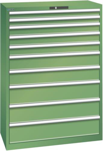 "longDescription": "LISTA Schubladenschrank, Lista Einheit: 54x27E, BxTxH: 1023x572x1450mm, Schubladen-Nutzfläche BxT: 918x459mm, Anzahl Schubladen: 10, Anzahl Fronthöhen (Tragkraft): 2x75mm (75kg), 3x100mm (75kg), 2x150mm (75kg), 3x200mm (75kg), Schliessart: Code Lock, elektronisches Zahlenschloss mit 10 Ziffern für 4- bis 6-stellige Codes, bis 100 Codes, Farbe Gehäuse: Resedagrün RAL 6011, Farbe Schubladen: Resedagrün RAL 6011. Höchste Stabilität: Gehäuse bis 4t belastbar, Schubladen mit 75 oder 200 kg Tragkraft. Maximale Ausnutzung dank Vollauszug und optimaler Mantelhöhe der Schubladen. Exzellente Schutzeigenschaften gegen Schmutz, Flüssigkeiten und mechanische Beanspruchung durch geschlossenes Gehäuse mit schlag- und abriebfester Oberfläche. Überzeugende Sicherheit: Aushebesicherung gegen Herausfallen der Schubladen und Einzelschubladensperre als Kippschutz. Korrosionsschutz durch Elektrophorese-Tauchlackierung und umweltfreundlichen Pulverlack. Optimale Ordnung und Organisation dank speziellem LISTA-Einteilungsmaterial für jeden Zweck und gelochter, geschlitzter Schubladen. Professionelle Beschriftung mit Beschriftungssoftware LISTA Script und hochklappbarer Griffleiste zum Einlegen der Etiketten. Perfekte Laufruhe durch traversenlos geführten Differenzialauszug. Flexible Anpassungsmöglichkeiten durch vorperforierte Löcher für Tischplatten (Punchout), Rollen, Schubladen, Schliesssysteme für einfaches Um- und Nachrüsten<br>",