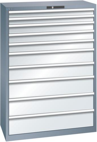 "longDescription": "LISTA Schubladenschrank, Lista Einheit: 54x27E, BxTxH: 1023x572x1450mm, Schubladen-Nutzfläche BxT: 918x459mm, Anzahl Schubladen: 10, Anzahl Fronthöhen (Tragkraft): 2x75mm (75kg), 3x100mm (75kg), 2x150mm (75kg), 3x200mm (75kg), Schliessart: Code Lock, elektronisches Zahlenschloss mit 10 Ziffern für 4- bis 6-stellige Codes, bis 100 Codes, Farbe Gehäuse: Grau metallic NCS S 6502-B, Farbe Schubladen: Lichtgrau RAL 7035. Höchste Stabilität: Gehäuse bis 4t belastbar, Schubladen mit 75 oder 200 kg Tragkraft. Maximale Ausnutzung dank Vollauszug und optimaler Mantelhöhe der Schubladen. Exzellente Schutzeigenschaften gegen Schmutz, Flüssigkeiten und mechanische Beanspruchung durch geschlossenes Gehäuse mit schlag- und abriebfester Oberfläche. Überzeugende Sicherheit: Aushebesicherung gegen Herausfallen der Schubladen und Einzelschubladensperre als Kippschutz. Korrosionsschutz durch Elektrophorese-Tauchlackierung und umweltfreundlichen Pulverlack. Optimale Ordnung und Organisation dank speziellem LISTA-Einteilungsmaterial für jeden Zweck und gelochter, geschlitzter Schubladen. Professionelle Beschriftung mit Beschriftungssoftware LISTA Script und hochklappbarer Griffleiste zum Einlegen der Etiketten. Perfekte Laufruhe durch traversenlos geführten Differenzialauszug. Flexible Anpassungsmöglichkeiten durch vorperforierte Löcher für Tischplatten (Punchout), Rollen, Schubladen, Schliesssysteme für einfaches Um- und Nachrüsten<br>",