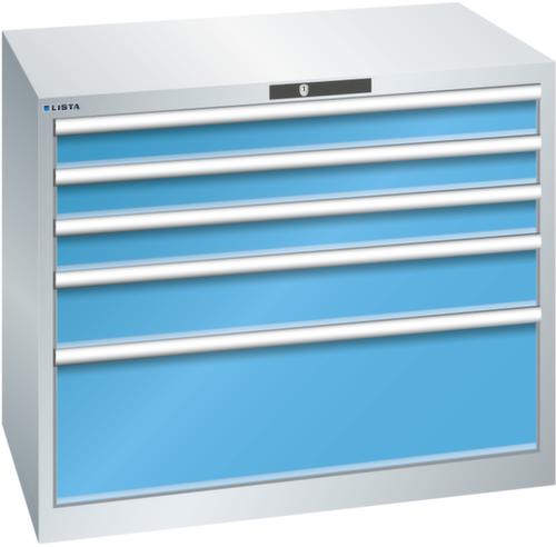 "longDescription": "LISTA Schubladenschrank, Lista Einheit: 54x36E, BxTxH: 1023x725x850mm, Schubladen-Nutzfläche BxT: 918x612mm, Anzahl Schubladen: 5, Anzahl Fronthöhen (Tragkraft): 3x100mm (75kg), 1x150mm (75kg), 1x300mm (200kg), Schliessart: Code Lock, elektronisches Zahlenschloss mit 10 Ziffern für 4- bis 6-stellige Codes, bis 100 Codes, Farbe Gehäuse: Lichtgrau RAL 7035, Farbe Schubladen: Lichtblau RAL 5012. Höchste Stabilität: Gehäuse bis 4t belastbar, Schubladen mit 75 oder 200 kg Tragkraft. Maximale Ausnutzung dank Vollauszug und optimaler Mantelhöhe der Schubladen. Exzellente Schutzeigenschaften gegen Schmutz, Flüssigkeiten und mechanische Beanspruchung durch geschlossenes Gehäuse mit schlag- und abriebfester Oberfläche. Überzeugende Sicherheit: Aushebesicherung gegen Herausfallen der Schubladen und Einzelschubladensperre als Kippschutz. Korrosionsschutz durch Elektrophorese-Tauchlackierung und umweltfreundlichen Pulverlack. Optimale Ordnung und Organisation dank speziellem LISTA-Einteilungsmaterial für jeden Zweck und gelochter, geschlitzter Schubladen. Professionelle Beschriftung mit Beschriftungssoftware LISTA Script und hochklappbarer Griffleiste zum Einlegen der Etiketten. Perfekte Laufruhe durch traversenlos geführten Differenzialauszug. Flexible Anpassungsmöglichkeiten durch vorperforierte Löcher für Tischplatten (Punchout), Rollen, Schubladen, Schliesssysteme für einfaches Um- und Nachrüsten<br>",