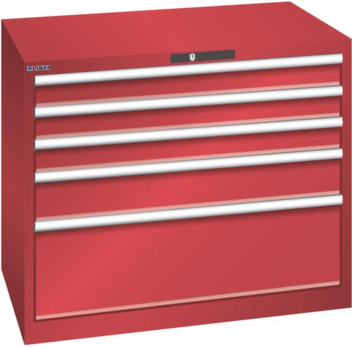"longDescription": "LISTA Schubladenschrank, Lista Einheit: 54x36E, BxTxH: 1023x725x850mm, Schubladen-Nutzfläche BxT: 918x612mm, Anzahl Schubladen: 5, Anzahl Fronthöhen (Tragkraft): 3x100mm (200kg), 1x150mm (200kg), 1x300mm (200kg), Schliessart: Code Lock, elektronisches Zahlenschloss mit 10 Ziffern für 4- bis 6-stellige Codes, bis 100 Codes, Farbe Gehäuse: Rubinrot RAL 3003, Farbe Schubladen: Rubinrot RAL 3003. Höchste Stabilität: Gehäuse bis 4t belastbar, Schubladen mit 75 oder 200 kg Tragkraft. Maximale Ausnutzung dank Vollauszug und optimaler Mantelhöhe der Schubladen. Exzellente Schutzeigenschaften gegen Schmutz, Flüssigkeiten und mechanische Beanspruchung durch geschlossenes Gehäuse mit schlag- und abriebfester Oberfläche. Überzeugende Sicherheit: Aushebesicherung gegen Herausfallen der Schubladen und Einzelschubladensperre als Kippschutz. Korrosionsschutz durch Elektrophorese-Tauchlackierung und umweltfreundlichen Pulverlack. Optimale Ordnung und Organisation dank speziellem LISTA-Einteilungsmaterial für jeden Zweck und gelochter, geschlitzter Schubladen. Professionelle Beschriftung mit Beschriftungssoftware LISTA Script und hochklappbarer Griffleiste zum Einlegen der Etiketten. Perfekte Laufruhe durch traversenlos geführten Differenzialauszug. Flexible Anpassungsmöglichkeiten durch vorperforierte Löcher für Tischplatten (Punchout), Rollen, Schubladen, Schliesssysteme für einfaches Um- und Nachrüsten<br>",