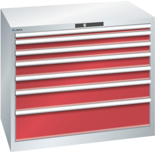"longDescription": "LISTA Schubladenschrank, Lista Einheit: 54x36E, BxTxH: 1023x725x850mm, Schubladen-Nutzfläche BxT: 918x612mm, Anzahl Schubladen: 7, Anzahl Fronthöhen (Tragkraft): 1x50mm (75kg), 2x75mm (75kg), 2x100mm (75kg), 1x150mm (75kg), 1x200mm (75kg), Schliessart: Key Lock, Standard-Schliessung mit Wechselyzlinder inkl. 2 Schlüsseln mit Schlüsselnummer, Farbe Gehäuse: Lichtgrau RAL 7035, Farbe Schubladen: Rubinrot RAL 3003. Höchste Stabilität: Gehäuse bis 4t belastbar, Schubladen mit 75 oder 200 kg Tragkraft. Maximale Ausnutzung dank Vollauszug und optimaler Mantelhöhe der Schubladen. Exzellente Schutzeigenschaften gegen Schmutz, Flüssigkeiten und mechanische Beanspruchung durch geschlossenes Gehäuse mit schlag- und abriebfester Oberfläche. Überzeugende Sicherheit: Aushebesicherung gegen Herausfallen der Schubladen und Einzelschubladensperre als Kippschutz. Korrosionsschutz durch Elektrophorese-Tauchlackierung und umweltfreundlichen Pulverlack. Optimale Ordnung und Organisation dank speziellem LISTA-Einteilungsmaterial für jeden Zweck und gelochter, geschlitzter Schubladen. Professionelle Beschriftung mit Beschriftungssoftware LISTA Script und hochklappbarer Griffleiste zum Einlegen der Etiketten. Perfekte Laufruhe durch traversenlos geführten Differenzialauszug. Flexible Anpassungsmöglichkeiten durch vorperforierte Löcher für Tischplatten (Punchout), Rollen, Schubladen, Schliesssysteme für einfaches Um- und Nachrüsten<br>",