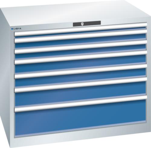 "longDescription": "LISTA Schubladenschrank, Lista Einheit: 54x36E, BxTxH: 1023x725x850mm, Schubladen-Nutzfläche BxT: 918x612mm, Anzahl Schubladen: 7, Anzahl Fronthöhen (Tragkraft): 1x50mm (75kg), 2x75mm (75kg), 2x100mm (75kg), 1x150mm (75kg), 1x200mm (75kg), Schliessart: Code Lock, elektronisches Zahlenschloss mit 10 Ziffern für 4- bis 6-stellige Codes, bis 100 Codes, Farbe Gehäuse: Lichtgrau RAL 7035, Farbe Schubladen: Signalblau RAL 5005. Höchste Stabilität: Gehäuse bis 4t belastbar, Schubladen mit 75 oder 200 kg Tragkraft. Maximale Ausnutzung dank Vollauszug und optimaler Mantelhöhe der Schubladen. Exzellente Schutzeigenschaften gegen Schmutz, Flüssigkeiten und mechanische Beanspruchung durch geschlossenes Gehäuse mit schlag- und abriebfester Oberfläche. Überzeugende Sicherheit: Aushebesicherung gegen Herausfallen der Schubladen und Einzelschubladensperre als Kippschutz. Korrosionsschutz durch Elektrophorese-Tauchlackierung und umweltfreundlichen Pulverlack. Optimale Ordnung und Organisation dank speziellem LISTA-Einteilungsmaterial für jeden Zweck und gelochter, geschlitzter Schubladen. Professionelle Beschriftung mit Beschriftungssoftware LISTA Script und hochklappbarer Griffleiste zum Einlegen der Etiketten. Perfekte Laufruhe durch traversenlos geführten Differenzialauszug. Flexible Anpassungsmöglichkeiten durch vorperforierte Löcher für Tischplatten (Punchout), Rollen, Schubladen, Schliesssysteme für einfaches Um- und Nachrüsten<br>",