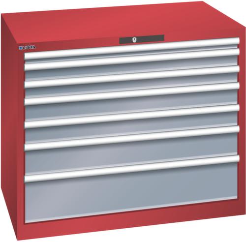 "longDescription": "LISTA Schubladenschrank, Lista Einheit: 54x36E, BxTxH: 1023x725x850mm, Schubladen-Nutzfläche BxT: 918x612mm, Anzahl Schubladen: 7, Anzahl Fronthöhen (Tragkraft): 1x50mm (75kg), 2x75mm (200kg), 2x100mm (200kg), 1x150mm (200kg), 1x200mm (200kg), Schliessart: Key Lock, Standard-Schliessung mit Wechselyzlinder inkl. 2 Schlüsseln mit Schlüsselnummer, Farbe Gehäuse: Rubinrot RAL 3003, Farbe Schubladen: Grau metallic NCS S 6502-B. Höchste Stabilität: Gehäuse bis 4t belastbar, Schubladen mit 75 oder 200 kg Tragkraft. Maximale Ausnutzung dank Vollauszug und optimaler Mantelhöhe der Schubladen. Exzellente Schutzeigenschaften gegen Schmutz, Flüssigkeiten und mechanische Beanspruchung durch geschlossenes Gehäuse mit schlag- und abriebfester Oberfläche. Überzeugende Sicherheit: Aushebesicherung gegen Herausfallen der Schubladen und Einzelschubladensperre als Kippschutz. Korrosionsschutz durch Elektrophorese-Tauchlackierung und umweltfreundlichen Pulverlack. Optimale Ordnung und Organisation dank speziellem LISTA-Einteilungsmaterial für jeden Zweck und gelochter, geschlitzter Schubladen. Professionelle Beschriftung mit Beschriftungssoftware LISTA Script und hochklappbarer Griffleiste zum Einlegen der Etiketten. Perfekte Laufruhe durch traversenlos geführten Differenzialauszug. Flexible Anpassungsmöglichkeiten durch vorperforierte Löcher für Tischplatten (Punchout), Rollen, Schubladen, Schliesssysteme für einfaches Um- und Nachrüsten<br>",