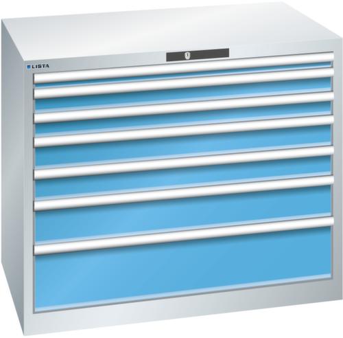 "longDescription": "LISTA Schubladenschrank, Lista Einheit: 54x36E, BxTxH: 1023x725x850mm, Schubladen-Nutzfläche BxT: 918x612mm, Anzahl Schubladen: 7, Anzahl Fronthöhen (Tragkraft): 1x50mm (75kg), 2x75mm (200kg), 2x100mm (200kg), 1x150mm (200kg), 1x200mm (200kg), Schliessart: Code Lock, elektronisches Zahlenschloss mit 10 Ziffern für 4- bis 6-stellige Codes, bis 100 Codes, Farbe Gehäuse: Lichtgrau RAL 7035, Farbe Schubladen: Lichtblau RAL 5012. Höchste Stabilität: Gehäuse bis 4t belastbar, Schubladen mit 75 oder 200 kg Tragkraft. Maximale Ausnutzung dank Vollauszug und optimaler Mantelhöhe der Schubladen. Exzellente Schutzeigenschaften gegen Schmutz, Flüssigkeiten und mechanische Beanspruchung durch geschlossenes Gehäuse mit schlag- und abriebfester Oberfläche. Überzeugende Sicherheit: Aushebesicherung gegen Herausfallen der Schubladen und Einzelschubladensperre als Kippschutz. Korrosionsschutz durch Elektrophorese-Tauchlackierung und umweltfreundlichen Pulverlack. Optimale Ordnung und Organisation dank speziellem LISTA-Einteilungsmaterial für jeden Zweck und gelochter, geschlitzter Schubladen. Professionelle Beschriftung mit Beschriftungssoftware LISTA Script und hochklappbarer Griffleiste zum Einlegen der Etiketten. Perfekte Laufruhe durch traversenlos geführten Differenzialauszug. Flexible Anpassungsmöglichkeiten durch vorperforierte Löcher für Tischplatten (Punchout), Rollen, Schubladen, Schliesssysteme für einfaches Um- und Nachrüsten<br>",