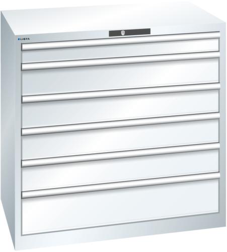 "longDescription": "LISTA Schubladenschrank, Lista Einheit: 54x36E, BxTxH: 1023x725x1000mm, Schubladen-Nutzfläche BxT: 918x612mm, Anzahl Schubladen: 6, Anzahl Fronthöhen (Tragkraft): 1x100mm (200kg), 4x150mm (200kg), 1x200mm (200kg), Schliessart: Key Lock, Standard-Schliessung mit Wechselyzlinder inkl. 2 Schlüsseln mit Schlüsselnummer, Farbe Gehäuse: Reinweiss RAL 9010, Farbe Schubladen: Reinweiss RAL 9010. Höchste Stabilität: Gehäuse bis 4t belastbar, Schubladen mit 75 oder 200 kg Tragkraft. Maximale Ausnutzung dank Vollauszug und optimaler Mantelhöhe der Schubladen. Exzellente Schutzeigenschaften gegen Schmutz, Flüssigkeiten und mechanische Beanspruchung durch geschlossenes Gehäuse mit schlag- und abriebfester Oberfläche. Überzeugende Sicherheit: Aushebesicherung gegen Herausfallen der Schubladen und Einzelschubladensperre als Kippschutz. Korrosionsschutz durch Elektrophorese-Tauchlackierung und umweltfreundlichen Pulverlack. Optimale Ordnung und Organisation dank speziellem LISTA-Einteilungsmaterial für jeden Zweck und gelochter, geschlitzter Schubladen. Professionelle Beschriftung mit Beschriftungssoftware LISTA Script und hochklappbarer Griffleiste zum Einlegen der Etiketten. Perfekte Laufruhe durch traversenlos geführten Differenzialauszug. Flexible Anpassungsmöglichkeiten durch vorperforierte Löcher für Tischplatten (Punchout), Rollen, Schubladen, Schliesssysteme für einfaches Um- und Nachrüsten<br>",