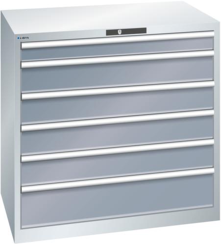 "longDescription": "LISTA Schubladenschrank, Lista Einheit: 54x36E, BxTxH: 1023x725x1000mm, Schubladen-Nutzfläche BxT: 918x612mm, Anzahl Schubladen: 6, Anzahl Fronthöhen (Tragkraft): 1x100mm (200kg), 4x150mm (200kg), 1x200mm (200kg), Schliessart: Code Lock, elektronisches Zahlenschloss mit 10 Ziffern für 4- bis 6-stellige Codes, bis 100 Codes, Farbe Gehäuse: Lichtgrau RAL 7035, Farbe Schubladen: Grau metallic NCS S 6502-B. Höchste Stabilität: Gehäuse bis 4t belastbar, Schubladen mit 75 oder 200 kg Tragkraft. Maximale Ausnutzung dank Vollauszug und optimaler Mantelhöhe der Schubladen. Exzellente Schutzeigenschaften gegen Schmutz, Flüssigkeiten und mechanische Beanspruchung durch geschlossenes Gehäuse mit schlag- und abriebfester Oberfläche. Überzeugende Sicherheit: Aushebesicherung gegen Herausfallen der Schubladen und Einzelschubladensperre als Kippschutz. Korrosionsschutz durch Elektrophorese-Tauchlackierung und umweltfreundlichen Pulverlack. Optimale Ordnung und Organisation dank speziellem LISTA-Einteilungsmaterial für jeden Zweck und gelochter, geschlitzter Schubladen. Professionelle Beschriftung mit Beschriftungssoftware LISTA Script und hochklappbarer Griffleiste zum Einlegen der Etiketten. Perfekte Laufruhe durch traversenlos geführten Differenzialauszug. Flexible Anpassungsmöglichkeiten durch vorperforierte Löcher für Tischplatten (Punchout), Rollen, Schubladen, Schliesssysteme für einfaches Um- und Nachrüsten<br>",