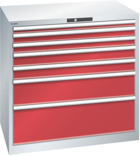 "longDescription": "LISTA Schubladenschrank, Lista Einheit: 54x36E, BxTxH: 1023x725x1000mm, Schubladen-Nutzfläche BxT: 918x612mm, Anzahl Schubladen: 7, Anzahl Fronthöhen (Tragkraft): 1x 50mm (75kg), 2x 75mm (75kg), 2x100mm (75kg), 1x200mm (75kg), 1x300mm (200kg), Schliessart: Code Lock, elektronisches Zahlenschloss mit 10 Ziffern für 4- bis 6-stellige Codes, bis 100 Codes, Farbe Gehäuse: Lichtgrau RAL 7035, Farbe Schubladen: Rubinrot RAL 3003. Höchste Stabilität: Gehäuse bis 4t belastbar, Schubladen mit 75 oder 200 kg Tragkraft. Maximale Ausnutzung dank Vollauszug und optimaler Mantelhöhe der Schubladen. Exzellente Schutzeigenschaften gegen Schmutz, Flüssigkeiten und mechanische Beanspruchung durch geschlossenes Gehäuse mit schlag- und abriebfester Oberfläche. Überzeugende Sicherheit: Aushebesicherung gegen Herausfallen der Schubladen und Einzelschubladensperre als Kippschutz. Korrosionsschutz durch Elektrophorese-Tauchlackierung und umweltfreundlichen Pulverlack. Optimale Ordnung und Organisation dank speziellem LISTA-Einteilungsmaterial für jeden Zweck und gelochter, geschlitzter Schubladen. Professionelle Beschriftung mit Beschriftungssoftware LISTA Script und hochklappbarer Griffleiste zum Einlegen der Etiketten. Perfekte Laufruhe durch traversenlos geführten Differenzialauszug. Flexible Anpassungsmöglichkeiten durch vorperforierte Löcher für Tischplatten (Punchout), Rollen, Schubladen, Schliesssysteme für einfaches Um- und Nachrüsten<br>",