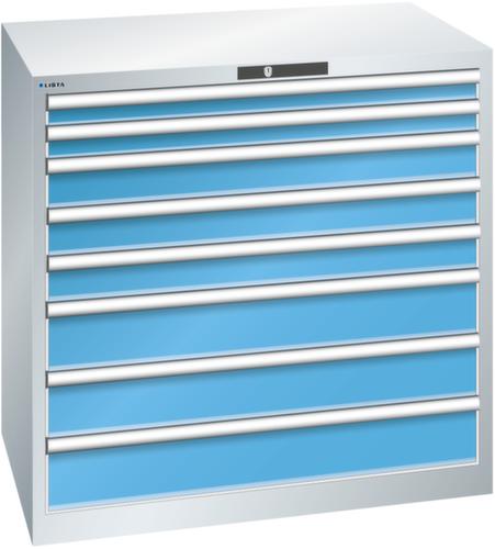 "longDescription": "LISTA Schubladenschrank, Lista Einheit: 54x36E, BxTxH: 1023x725x1000mm, Schubladen-Nutzfläche BxT: 918x612mm, Anzahl Schubladen: 8, Anzahl Fronthöhen (Tragkraft): 2x 75mm (200kg), 3x100mm (200kg), 3x150mm (200kg), Schliessart: Code Lock, elektronisches Zahlenschloss mit 10 Ziffern für 4- bis 6-stellige Codes, bis 100 Codes, Farbe Gehäuse: Lichtgrau RAL 7035, Farbe Schubladen: Lichtblau RAL 5012. Höchste Stabilität: Gehäuse bis 4t belastbar, Schubladen mit 75 oder 200 kg Tragkraft. Maximale Ausnutzung dank Vollauszug und optimaler Mantelhöhe der Schubladen. Exzellente Schutzeigenschaften gegen Schmutz, Flüssigkeiten und mechanische Beanspruchung durch geschlossenes Gehäuse mit schlag- und abriebfester Oberfläche. Überzeugende Sicherheit: Aushebesicherung gegen Herausfallen der Schubladen und Einzelschubladensperre als Kippschutz. Korrosionsschutz durch Elektrophorese-Tauchlackierung und umweltfreundlichen Pulverlack. Optimale Ordnung und Organisation dank speziellem LISTA-Einteilungsmaterial für jeden Zweck und gelochter, geschlitzter Schubladen. Professionelle Beschriftung mit Beschriftungssoftware LISTA Script und hochklappbarer Griffleiste zum Einlegen der Etiketten. Perfekte Laufruhe durch traversenlos geführten Differenzialauszug. Flexible Anpassungsmöglichkeiten durch vorperforierte Löcher für Tischplatten (Punchout), Rollen, Schubladen, Schliesssysteme für einfaches Um- und Nachrüsten<br>",