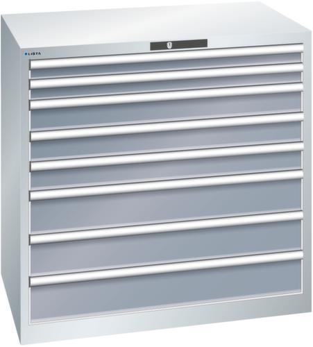 "longDescription": "LISTA Schubladenschrank, Lista Einheit: 54x36E, BxTxH: 1023x725x1000mm, Schubladen-Nutzfläche BxT: 918x612mm, Anzahl Schubladen: 8, Anzahl Fronthöhen (Tragkraft): 2x 75mm (75kg), 3x100mm (75kg), 3x150mm (75kg), Schliessart: Code Lock, elektronisches Zahlenschloss mit 10 Ziffern für 4- bis 6-stellige Codes, bis 100 Codes, Farbe Gehäuse: Lichtgrau RAL 7035, Farbe Schubladen: Grau metallic NCS S 6502-B. Höchste Stabilität: Gehäuse bis 4t belastbar, Schubladen mit 75 oder 200 kg Tragkraft. Maximale Ausnutzung dank Vollauszug und optimaler Mantelhöhe der Schubladen. Exzellente Schutzeigenschaften gegen Schmutz, Flüssigkeiten und mechanische Beanspruchung durch geschlossenes Gehäuse mit schlag- und abriebfester Oberfläche. Überzeugende Sicherheit: Aushebesicherung gegen Herausfallen der Schubladen und Einzelschubladensperre als Kippschutz. Korrosionsschutz durch Elektrophorese-Tauchlackierung und umweltfreundlichen Pulverlack. Optimale Ordnung und Organisation dank speziellem LISTA-Einteilungsmaterial für jeden Zweck und gelochter, geschlitzter Schubladen. Professionelle Beschriftung mit Beschriftungssoftware LISTA Script und hochklappbarer Griffleiste zum Einlegen der Etiketten. Perfekte Laufruhe durch traversenlos geführten Differenzialauszug. Flexible Anpassungsmöglichkeiten durch vorperforierte Löcher für Tischplatten (Punchout), Rollen, Schubladen, Schliesssysteme für einfaches Um- und Nachrüsten<br>",
