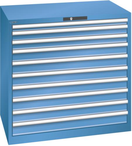 "longDescription": "LISTA Schubladenschrank, Lista Einheit: 54x36E, BxTxH: 1023x725x1000mm, Schubladen-Nutzfläche BxT: 918x612mm, Anzahl Schubladen: 10, Anzahl Fronthöhen (Tragkraft): 1x 50mm (75kg), 2x 75mm (75kg), 7x100mm (75kg), Schliessart: Code Lock, elektronisches Zahlenschloss mit 10 Ziffern für 4- bis 6-stellige Codes, bis 100 Codes, Farbe Gehäuse: Capriblau RAL 5019, Farbe Schubladen: Capriblau RAL 5019. Höchste Stabilität: Gehäuse bis 4t belastbar, Schubladen mit 75 oder 200 kg Tragkraft. Maximale Ausnutzung dank Vollauszug und optimaler Mantelhöhe der Schubladen. Exzellente Schutzeigenschaften gegen Schmutz, Flüssigkeiten und mechanische Beanspruchung durch geschlossenes Gehäuse mit schlag- und abriebfester Oberfläche. Überzeugende Sicherheit: Aushebesicherung gegen Herausfallen der Schubladen und Einzelschubladensperre als Kippschutz. Korrosionsschutz durch Elektrophorese-Tauchlackierung und umweltfreundlichen Pulverlack. Optimale Ordnung und Organisation dank speziellem LISTA-Einteilungsmaterial für jeden Zweck und gelochter, geschlitzter Schubladen. Professionelle Beschriftung mit Beschriftungssoftware LISTA Script und hochklappbarer Griffleiste zum Einlegen der Etiketten. Perfekte Laufruhe durch traversenlos geführten Differenzialauszug. Flexible Anpassungsmöglichkeiten durch vorperforierte Löcher für Tischplatten (Punchout), Rollen, Schubladen, Schliesssysteme für einfaches Um- und Nachrüsten<br>",