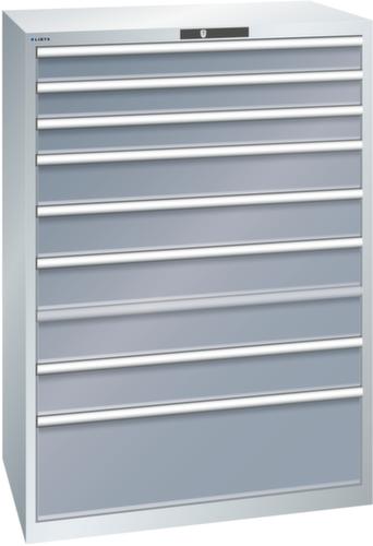 "longDescription": "LISTA Schubladenschrank, Lista Einheit: 54x36E, BxTxH: 1023x725x1450mm, Schubladen-Nutzfläche BxT: 918x612mm, Anzahl Schubladen: 9, Anzahl Fronthöhen (Tragkraft): 3x100mm (200kg), 5x150mm (200kg), 1x300mm (200kg), Schliessart: Key Lock, Standard-Schliessung mit Wechselyzlinder inkl. 2 Schlüsseln mit Schlüsselnummer, Farbe Gehäuse: Lichtgrau RAL 7035, Farbe Schubladen: Grau metallic NCS S 6502-B. Höchste Stabilität: Gehäuse bis 4t belastbar, Schubladen mit 75 oder 200 kg Tragkraft. Maximale Ausnutzung dank Vollauszug und optimaler Mantelhöhe der Schubladen. Exzellente Schutzeigenschaften gegen Schmutz, Flüssigkeiten und mechanische Beanspruchung durch geschlossenes Gehäuse mit schlag- und abriebfester Oberfläche. Überzeugende Sicherheit: Aushebesicherung gegen Herausfallen der Schubladen und Einzelschubladensperre als Kippschutz. Korrosionsschutz durch Elektrophorese-Tauchlackierung und umweltfreundlichen Pulverlack. Optimale Ordnung und Organisation dank speziellem LISTA-Einteilungsmaterial für jeden Zweck und gelochter, geschlitzter Schubladen. Professionelle Beschriftung mit Beschriftungssoftware LISTA Script und hochklappbarer Griffleiste zum Einlegen der Etiketten. Perfekte Laufruhe durch traversenlos geführten Differenzialauszug. Flexible Anpassungsmöglichkeiten durch vorperforierte Löcher für Tischplatten (Punchout), Rollen, Schubladen, Schliesssysteme für einfaches Um- und Nachrüsten<br>",
