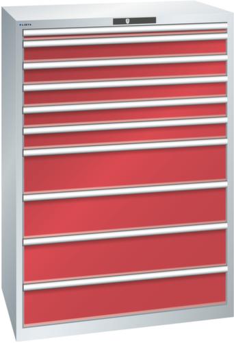 "longDescription": "LISTA Schubladenschrank, Lista Einheit: 54x36E, BxTxH: 1023x725x1450mm, Schubladen-Nutzfläche BxT: 918x612mm, Anzahl Schubladen: 10, Anzahl Fronthöhen (Tragkraft): 1x 50mm (75kg), 5x100mm (200kg), 4x200mm (200kg), Schliessart: Key Lock, Standard-Schliessung mit Wechselyzlinder inkl. 2 Schlüsseln mit Schlüsselnummer, Farbe Gehäuse: Lichtgrau RAL 7035, Farbe Schubladen: Rubinrot RAL 3003. Höchste Stabilität: Gehäuse bis 4t belastbar, Schubladen mit 75 oder 200 kg Tragkraft. Maximale Ausnutzung dank Vollauszug und optimaler Mantelhöhe der Schubladen. Exzellente Schutzeigenschaften gegen Schmutz, Flüssigkeiten und mechanische Beanspruchung durch geschlossenes Gehäuse mit schlag- und abriebfester Oberfläche. Überzeugende Sicherheit: Aushebesicherung gegen Herausfallen der Schubladen und Einzelschubladensperre als Kippschutz. Korrosionsschutz durch Elektrophorese-Tauchlackierung und umweltfreundlichen Pulverlack. Optimale Ordnung und Organisation dank speziellem LISTA-Einteilungsmaterial für jeden Zweck und gelochter, geschlitzter Schubladen. Professionelle Beschriftung mit Beschriftungssoftware LISTA Script und hochklappbarer Griffleiste zum Einlegen der Etiketten. Perfekte Laufruhe durch traversenlos geführten Differenzialauszug. Flexible Anpassungsmöglichkeiten durch vorperforierte Löcher für Tischplatten (Punchout), Rollen, Schubladen, Schliesssysteme für einfaches Um- und Nachrüsten<br>",