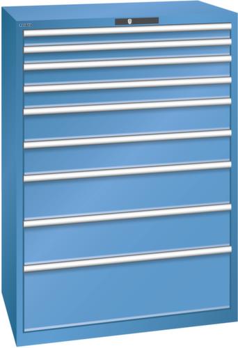 "longDescription": "LISTA Schubladenschrank, Lista Einheit: 54x36E, BxTxH: 1023x725x1450mm, Schubladen-Nutzfläche BxT: 918x612mm, Anzahl Schubladen: 9, Anzahl Fronthöhen (Tragkraft): 2x 75mm (75kg), 2x100mm (75kg), 2x150mm (75kg), 2x200mm (75kg), 1x300mm (200kg), Schliessart: Key Lock, Standard-Schliessung mit Wechselyzlinder inkl. 2 Schlüsseln mit Schlüsselnummer, Farbe Gehäuse: Capriblau RAL 5019, Farbe Schubladen: Capriblau RAL 5019. Höchste Stabilität: Gehäuse bis 4t belastbar, Schubladen mit 75 oder 200 kg Tragkraft. Maximale Ausnutzung dank Vollauszug und optimaler Mantelhöhe der Schubladen. Exzellente Schutzeigenschaften gegen Schmutz, Flüssigkeiten und mechanische Beanspruchung durch geschlossenes Gehäuse mit schlag- und abriebfester Oberfläche. Überzeugende Sicherheit: Aushebesicherung gegen Herausfallen der Schubladen und Einzelschubladensperre als Kippschutz. Korrosionsschutz durch Elektrophorese-Tauchlackierung und umweltfreundlichen Pulverlack. Optimale Ordnung und Organisation dank speziellem LISTA-Einteilungsmaterial für jeden Zweck und gelochter, geschlitzter Schubladen. Professionelle Beschriftung mit Beschriftungssoftware LISTA Script und hochklappbarer Griffleiste zum Einlegen der Etiketten. Perfekte Laufruhe durch traversenlos geführten Differenzialauszug. Flexible Anpassungsmöglichkeiten durch vorperforierte Löcher für Tischplatten (Punchout), Rollen, Schubladen, Schliesssysteme für einfaches Um- und Nachrüsten<br>",