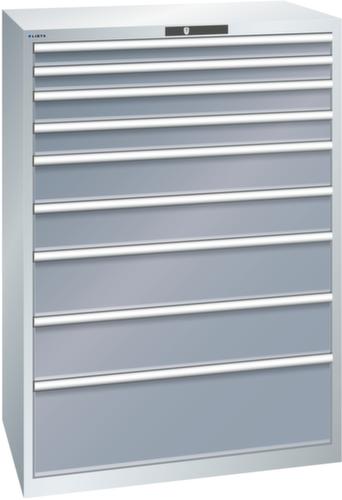 "longDescription": "LISTA Schubladenschrank, Lista Einheit: 54x36E, BxTxH: 1023x725x1450mm, Schubladen-Nutzfläche BxT: 918x612mm, Anzahl Schubladen: 9, Anzahl Fronthöhen (Tragkraft): 2x 75mm (75kg), 2x100mm (75kg), 2x150mm (75kg), 2x200mm (75kg), 1x300mm (200kg), Schliessart: Code Lock, elektronisches Zahlenschloss mit 10 Ziffern für 4- bis 6-stellige Codes, bis 100 Codes, Farbe Gehäuse: Lichtgrau RAL 7035, Farbe Schubladen: Grau metallic NCS S 6502-B. Höchste Stabilität: Gehäuse bis 4t belastbar, Schubladen mit 75 oder 200 kg Tragkraft. Maximale Ausnutzung dank Vollauszug und optimaler Mantelhöhe der Schubladen. Exzellente Schutzeigenschaften gegen Schmutz, Flüssigkeiten und mechanische Beanspruchung durch geschlossenes Gehäuse mit schlag- und abriebfester Oberfläche. Überzeugende Sicherheit: Aushebesicherung gegen Herausfallen der Schubladen und Einzelschubladensperre als Kippschutz. Korrosionsschutz durch Elektrophorese-Tauchlackierung und umweltfreundlichen Pulverlack. Optimale Ordnung und Organisation dank speziellem LISTA-Einteilungsmaterial für jeden Zweck und gelochter, geschlitzter Schubladen. Professionelle Beschriftung mit Beschriftungssoftware LISTA Script und hochklappbarer Griffleiste zum Einlegen der Etiketten. Perfekte Laufruhe durch traversenlos geführten Differenzialauszug. Flexible Anpassungsmöglichkeiten durch vorperforierte Löcher für Tischplatten (Punchout), Rollen, Schubladen, Schliesssysteme für einfaches Um- und Nachrüsten<br>",