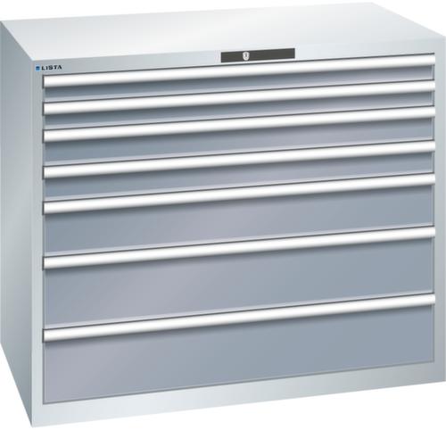 "longDescription": "LISTA Schubladenschrank, Lista Einheit: 64x36E, BxTxH: 1193x725x1000mm, Schubladen-Nutzfläche BxT: 1088x612mm, Anzahl Schubladen: 7, Anzahl Fronthöhen (Tragkraft): 2x75mm (75kg), 2x100mm (75kg), 1x150mm (200kg), 2x200mm (200kg), Schliessart: Key Lock, Standard-Schliessung mit Wechselyzlinder inkl. 2 Schlüsseln mit Schlüsselnummer, Farbe Gehäuse: Lichtgrau RAL 7035, Farbe Schubladen: Grau metallic NCS S 6502-B. Höchste Stabilität: Gehäuse bis 4t belastbar, Schubladen mit 75 oder 200 kg Tragkraft. Maximale Ausnutzung dank Vollauszug und optimaler Mantelhöhe der Schubladen. Exzellente Schutzeigenschaften gegen Schmutz, Flüssigkeiten und mechanische Beanspruchung durch geschlossenes Gehäuse mit schlag- und abriebfester Oberfläche. Überzeugende Sicherheit: Aushebesicherung gegen Herausfallen der Schubladen und Einzelschubladensperre als Kippschutz. Korrosionsschutz durch Elektrophorese-Tauchlackierung und umweltfreundlichen Pulverlack. Optimale Ordnung und Organisation dank speziellem LISTA-Einteilungsmaterial für jeden Zweck und gelochter, geschlitzter Schubladen. Professionelle Beschriftung mit Beschriftungssoftware LISTA Script und hochklappbarer Griffleiste zum Einlegen der Etiketten. Perfekte Laufruhe durch traversenlos geführten Differenzialauszug. Flexible Anpassungsmöglichkeiten durch vorperforierte Löcher für Tischplatten (Punchout), Rollen, Schubladen, Schliesssysteme für einfaches Um- und Nachrüsten<br>",
