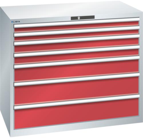 "longDescription": "LISTA Schubladenschrank, Lista Einheit: 64x36E, BxTxH: 1193x725x1000mm, Schubladen-Nutzfläche BxT: 1088x612mm, Anzahl Schubladen: 7, Anzahl Fronthöhen (Tragkraft): 2x75mm (75kg), 2x100mm (75kg), 1x150mm (200kg), 2x200mm (200kg), Schliessart: Code Lock, elektronisches Zahlenschloss mit 10 Ziffern für 4- bis 6-stellige Codes, bis 100 Codes, Farbe Gehäuse: Lichtgrau RAL 7035, Farbe Schubladen: Rubinrot RAL 3003. Höchste Stabilität: Gehäuse bis 4t belastbar, Schubladen mit 75 oder 200 kg Tragkraft. Maximale Ausnutzung dank Vollauszug und optimaler Mantelhöhe der Schubladen. Exzellente Schutzeigenschaften gegen Schmutz, Flüssigkeiten und mechanische Beanspruchung durch geschlossenes Gehäuse mit schlag- und abriebfester Oberfläche. Überzeugende Sicherheit: Aushebesicherung gegen Herausfallen der Schubladen und Einzelschubladensperre als Kippschutz. Korrosionsschutz durch Elektrophorese-Tauchlackierung und umweltfreundlichen Pulverlack. Optimale Ordnung und Organisation dank speziellem LISTA-Einteilungsmaterial für jeden Zweck und gelochter, geschlitzter Schubladen. Professionelle Beschriftung mit Beschriftungssoftware LISTA Script und hochklappbarer Griffleiste zum Einlegen der Etiketten. Perfekte Laufruhe durch traversenlos geführten Differenzialauszug. Flexible Anpassungsmöglichkeiten durch vorperforierte Löcher für Tischplatten (Punchout), Rollen, Schubladen, Schliesssysteme für einfaches Um- und Nachrüsten<br>",