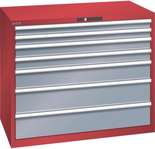 "longDescription": "LISTA Schubladenschrank, Lista Einheit: 64x36E, BxTxH: 1193x725x1000mm, Schubladen-Nutzfläche BxT: 1088x612mm, Anzahl Schubladen: 7, Anzahl Fronthöhen (Tragkraft): 2x75mm (200kg), 2x100mm (200kg), 1x150mm (200kg), 2x200mm (200kg), Schliessart: Key Lock, Standard-Schliessung mit Wechselyzlinder inkl. 2 Schlüsseln mit Schlüsselnummer, Farbe Gehäuse: Rubinrot RAL 3003, Farbe Schubladen: Grau metallic NCS S 6502-B. Höchste Stabilität: Gehäuse bis 4t belastbar, Schubladen mit 75 oder 200 kg Tragkraft. Maximale Ausnutzung dank Vollauszug und optimaler Mantelhöhe der Schubladen. Exzellente Schutzeigenschaften gegen Schmutz, Flüssigkeiten und mechanische Beanspruchung durch geschlossenes Gehäuse mit schlag- und abriebfester Oberfläche. Überzeugende Sicherheit: Aushebesicherung gegen Herausfallen der Schubladen und Einzelschubladensperre als Kippschutz. Korrosionsschutz durch Elektrophorese-Tauchlackierung und umweltfreundlichen Pulverlack. Optimale Ordnung und Organisation dank speziellem LISTA-Einteilungsmaterial für jeden Zweck und gelochter, geschlitzter Schubladen. Professionelle Beschriftung mit Beschriftungssoftware LISTA Script und hochklappbarer Griffleiste zum Einlegen der Etiketten. Perfekte Laufruhe durch traversenlos geführten Differenzialauszug. Flexible Anpassungsmöglichkeiten durch vorperforierte Löcher für Tischplatten (Punchout), Rollen, Schubladen, Schliesssysteme für einfaches Um- und Nachrüsten<br>",