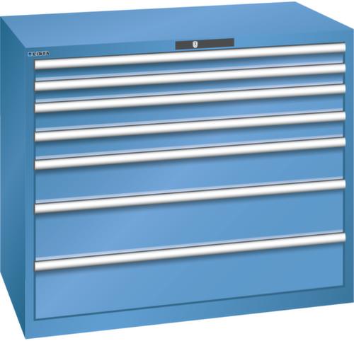 "longDescription": "LISTA Schubladenschrank, Lista Einheit: 64x36E, BxTxH: 1193x725x1000mm, Schubladen-Nutzfläche BxT: 1088x612mm, Anzahl Schubladen: 7, Anzahl Fronthöhen (Tragkraft): 2x75mm (200kg), 2x100mm (200kg), 1x150mm (200kg), 2x200mm (200kg), Schliessart: Code Lock, elektronisches Zahlenschloss mit 10 Ziffern für 4- bis 6-stellige Codes, bis 100 Codes, Farbe Gehäuse: Capriblau RAL 5019, Farbe Schubladen: Capriblau RAL 5019. Höchste Stabilität: Gehäuse bis 4t belastbar, Schubladen mit 75 oder 200 kg Tragkraft. Maximale Ausnutzung dank Vollauszug und optimaler Mantelhöhe der Schubladen. Exzellente Schutzeigenschaften gegen Schmutz, Flüssigkeiten und mechanische Beanspruchung durch geschlossenes Gehäuse mit schlag- und abriebfester Oberfläche. Überzeugende Sicherheit: Aushebesicherung gegen Herausfallen der Schubladen und Einzelschubladensperre als Kippschutz. Korrosionsschutz durch Elektrophorese-Tauchlackierung und umweltfreundlichen Pulverlack. Optimale Ordnung und Organisation dank speziellem LISTA-Einteilungsmaterial für jeden Zweck und gelochter, geschlitzter Schubladen. Professionelle Beschriftung mit Beschriftungssoftware LISTA Script und hochklappbarer Griffleiste zum Einlegen der Etiketten. Perfekte Laufruhe durch traversenlos geführten Differenzialauszug. Flexible Anpassungsmöglichkeiten durch vorperforierte Löcher für Tischplatten (Punchout), Rollen, Schubladen, Schliesssysteme für einfaches Um- und Nachrüsten<br>",