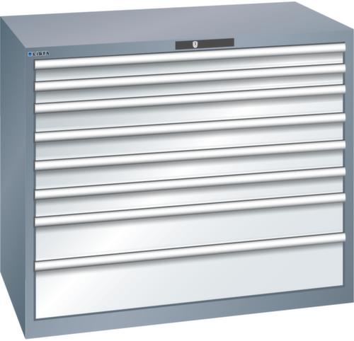 "longDescription": "LISTA Schubladenschrank, Lista Einheit: 64x36E, BxTxH: 1193x725x1000mm, Schubladen-Nutzfläche BxT: 1088x612mm, Anzahl Schubladen: 8, Anzahl Fronthöhen (Tragkraft): 2x75mm (75kg), 4x100mm (75kg), 1x150mm (200kg), 1x200mm (200kg), Schliessart: Code Lock, elektronisches Zahlenschloss mit 10 Ziffern für 4- bis 6-stellige Codes, bis 100 Codes, Farbe Gehäuse: Grau metallic NCS S 6502-B, Farbe Schubladen: Lichtgrau RAL 7035. Höchste Stabilität: Gehäuse bis 4t belastbar, Schubladen mit 75 oder 200 kg Tragkraft. Maximale Ausnutzung dank Vollauszug und optimaler Mantelhöhe der Schubladen. Exzellente Schutzeigenschaften gegen Schmutz, Flüssigkeiten und mechanische Beanspruchung durch geschlossenes Gehäuse mit schlag- und abriebfester Oberfläche. Überzeugende Sicherheit: Aushebesicherung gegen Herausfallen der Schubladen und Einzelschubladensperre als Kippschutz. Korrosionsschutz durch Elektrophorese-Tauchlackierung und umweltfreundlichen Pulverlack. Optimale Ordnung und Organisation dank speziellem LISTA-Einteilungsmaterial für jeden Zweck und gelochter, geschlitzter Schubladen. Professionelle Beschriftung mit Beschriftungssoftware LISTA Script und hochklappbarer Griffleiste zum Einlegen der Etiketten. Perfekte Laufruhe durch traversenlos geführten Differenzialauszug. Flexible Anpassungsmöglichkeiten durch vorperforierte Löcher für Tischplatten (Punchout), Rollen, Schubladen, Schliesssysteme für einfaches Um- und Nachrüsten<br>",