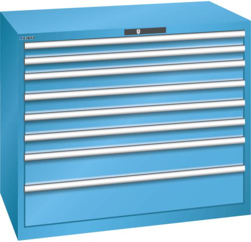"longDescription": "LISTA Schubladenschrank, Lista Einheit: 64x36E, BxTxH: 1193x725x1000mm, Schubladen-Nutzfläche BxT: 1088x612mm, Anzahl Schubladen: 8, Anzahl Fronthöhen (Tragkraft): 2x75mm (200kg), 4x100mm (200kg), 1x150mm (200kg), 1x200mm (200kg), Schliessart: Code Lock, elektronisches Zahlenschloss mit 10 Ziffern für 4- bis 6-stellige Codes, bis 100 Codes, Farbe Gehäuse: Lichtblau RAL 5012, Farbe Schubladen: Lichtblau RAL 5012. Höchste Stabilität: Gehäuse bis 4t belastbar, Schubladen mit 75 oder 200 kg Tragkraft. Maximale Ausnutzung dank Vollauszug und optimaler Mantelhöhe der Schubladen. Exzellente Schutzeigenschaften gegen Schmutz, Flüssigkeiten und mechanische Beanspruchung durch geschlossenes Gehäuse mit schlag- und abriebfester Oberfläche. Überzeugende Sicherheit: Aushebesicherung gegen Herausfallen der Schubladen und Einzelschubladensperre als Kippschutz. Korrosionsschutz durch Elektrophorese-Tauchlackierung und umweltfreundlichen Pulverlack. Optimale Ordnung und Organisation dank speziellem LISTA-Einteilungsmaterial für jeden Zweck und gelochter, geschlitzter Schubladen. Professionelle Beschriftung mit Beschriftungssoftware LISTA Script und hochklappbarer Griffleiste zum Einlegen der Etiketten. Perfekte Laufruhe durch traversenlos geführten Differenzialauszug. Flexible Anpassungsmöglichkeiten durch vorperforierte Löcher für Tischplatten (Punchout), Rollen, Schubladen, Schliesssysteme für einfaches Um- und Nachrüsten<br>",