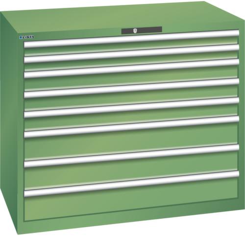 "longDescription": "LISTA Schubladenschrank, Lista Einheit: 64x36E, BxTxH: 1193x725x1000mm, Schubladen-Nutzfläche BxT: 1088x612mm, Anzahl Schubladen: 8, Anzahl Fronthöhen (Tragkraft): 2x75mm (200kg), 3x100mm (200kg), 3x150mm (200kg), Schliessart: Key Lock, Standard-Schliessung mit Wechselyzlinder inkl. 2 Schlüsseln mit Schlüsselnummer, Farbe Gehäuse: Resedagrün RAL 6011, Farbe Schubladen: Resedagrün RAL 6011. Höchste Stabilität: Gehäuse bis 4t belastbar, Schubladen mit 75 oder 200 kg Tragkraft. Maximale Ausnutzung dank Vollauszug und optimaler Mantelhöhe der Schubladen. Exzellente Schutzeigenschaften gegen Schmutz, Flüssigkeiten und mechanische Beanspruchung durch geschlossenes Gehäuse mit schlag- und abriebfester Oberfläche. Überzeugende Sicherheit: Aushebesicherung gegen Herausfallen der Schubladen und Einzelschubladensperre als Kippschutz. Korrosionsschutz durch Elektrophorese-Tauchlackierung und umweltfreundlichen Pulverlack. Optimale Ordnung und Organisation dank speziellem LISTA-Einteilungsmaterial für jeden Zweck und gelochter, geschlitzter Schubladen. Professionelle Beschriftung mit Beschriftungssoftware LISTA Script und hochklappbarer Griffleiste zum Einlegen der Etiketten. Perfekte Laufruhe durch traversenlos geführten Differenzialauszug. Flexible Anpassungsmöglichkeiten durch vorperforierte Löcher für Tischplatten (Punchout), Rollen, Schubladen, Schliesssysteme für einfaches Um- und Nachrüsten<br>",