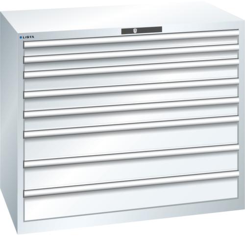 "longDescription": "LISTA Schubladenschrank, Lista Einheit: 64x36E, BxTxH: 1193x725x1000mm, Schubladen-Nutzfläche BxT: 1088x612mm, Anzahl Schubladen: 8, Anzahl Fronthöhen (Tragkraft): 2x75mm (200kg), 3x100mm (200kg), 3x150mm (200kg), Schliessart: Key Lock, Standard-Schliessung mit Wechselyzlinder inkl. 2 Schlüsseln mit Schlüsselnummer, Farbe Gehäuse: Reinweiss RAL 9010, Farbe Schubladen: Reinweiss RAL 9010. Höchste Stabilität: Gehäuse bis 4t belastbar, Schubladen mit 75 oder 200 kg Tragkraft. Maximale Ausnutzung dank Vollauszug und optimaler Mantelhöhe der Schubladen. Exzellente Schutzeigenschaften gegen Schmutz, Flüssigkeiten und mechanische Beanspruchung durch geschlossenes Gehäuse mit schlag- und abriebfester Oberfläche. Überzeugende Sicherheit: Aushebesicherung gegen Herausfallen der Schubladen und Einzelschubladensperre als Kippschutz. Korrosionsschutz durch Elektrophorese-Tauchlackierung und umweltfreundlichen Pulverlack. Optimale Ordnung und Organisation dank speziellem LISTA-Einteilungsmaterial für jeden Zweck und gelochter, geschlitzter Schubladen. Professionelle Beschriftung mit Beschriftungssoftware LISTA Script und hochklappbarer Griffleiste zum Einlegen der Etiketten. Perfekte Laufruhe durch traversenlos geführten Differenzialauszug. Flexible Anpassungsmöglichkeiten durch vorperforierte Löcher für Tischplatten (Punchout), Rollen, Schubladen, Schliesssysteme für einfaches Um- und Nachrüsten<br>",