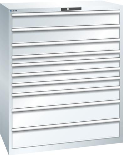 "longDescription": "LISTA Schubladenschrank, Lista Einheit: 64x36E, BxTxH: 1193x725x1450mm, Schubladen-Nutzfläche BxT: 1088x612mm, Anzahl Schubladen: 10, Anzahl Fronthöhen (Tragkraft): 2x150mm (200kg), 1x125mm (200kg), 1x75mm (200kg), 3x100mm (200kg), 1x150mm (200kg), 2x200mm (200kg), Schliessart: Key Lock, Standard-Schliessung mit Wechselyzlinder inkl. 2 Schlüsseln mit Schlüsselnummer, Farbe Gehäuse: Reinweiss RAL 9010, Farbe Schubladen: Reinweiss RAL 9010. Höchste Stabilität: Gehäuse bis 4t belastbar, Schubladen mit 75 oder 200 kg Tragkraft. Maximale Ausnutzung dank Vollauszug und optimaler Mantelhöhe der Schubladen. Exzellente Schutzeigenschaften gegen Schmutz, Flüssigkeiten und mechanische Beanspruchung durch geschlossenes Gehäuse mit schlag- und abriebfester Oberfläche. Überzeugende Sicherheit: Aushebesicherung gegen Herausfallen der Schubladen und Einzelschubladensperre als Kippschutz. Korrosionsschutz durch Elektrophorese-Tauchlackierung und umweltfreundlichen Pulverlack. Optimale Ordnung und Organisation dank speziellem LISTA-Einteilungsmaterial für jeden Zweck und gelochter, geschlitzter Schubladen. Professionelle Beschriftung mit Beschriftungssoftware LISTA Script und hochklappbarer Griffleiste zum Einlegen der Etiketten. Perfekte Laufruhe durch traversenlos geführten Differenzialauszug. Flexible Anpassungsmöglichkeiten durch vorperforierte Löcher für Tischplatten (Punchout), Rollen, Schubladen, Schliesssysteme für einfaches Um- und Nachrüsten<br>",