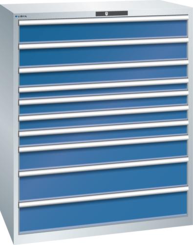 "longDescription": "LISTA Schubladenschrank, Lista Einheit: 64x36E, BxTxH: 1193x725x1450mm, Schubladen-Nutzfläche BxT: 1088x612mm, Anzahl Schubladen: 10, Anzahl Fronthöhen (Tragkraft): 2x150mm (200kg), 1x125mm (200kg), 1x75mm (200kg), 3x100mm (200kg), 1x150mm (200kg), 2x200mm (200kg), Schliessart: Key Lock, Standard-Schliessung mit Wechselyzlinder inkl. 2 Schlüsseln mit Schlüsselnummer, Farbe Gehäuse: Lichtgrau RAL 7035, Farbe Schubladen: Signalblau RAL 5005. Höchste Stabilität: Gehäuse bis 4t belastbar, Schubladen mit 75 oder 200 kg Tragkraft. Maximale Ausnutzung dank Vollauszug und optimaler Mantelhöhe der Schubladen. Exzellente Schutzeigenschaften gegen Schmutz, Flüssigkeiten und mechanische Beanspruchung durch geschlossenes Gehäuse mit schlag- und abriebfester Oberfläche. Überzeugende Sicherheit: Aushebesicherung gegen Herausfallen der Schubladen und Einzelschubladensperre als Kippschutz. Korrosionsschutz durch Elektrophorese-Tauchlackierung und umweltfreundlichen Pulverlack. Optimale Ordnung und Organisation dank speziellem LISTA-Einteilungsmaterial für jeden Zweck und gelochter, geschlitzter Schubladen. Professionelle Beschriftung mit Beschriftungssoftware LISTA Script und hochklappbarer Griffleiste zum Einlegen der Etiketten. Perfekte Laufruhe durch traversenlos geführten Differenzialauszug. Flexible Anpassungsmöglichkeiten durch vorperforierte Löcher für Tischplatten (Punchout), Rollen, Schubladen, Schliesssysteme für einfaches Um- und Nachrüsten<br>",