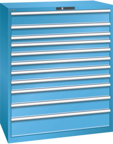 "longDescription": "LISTA Schubladenschrank, Lista Einheit: 64x36E, BxTxH: 1193x725x1450mm, Schubladen-Nutzfläche BxT: 1088x612mm, Anzahl Schubladen: 11, Anzahl Fronthöhen (Tragkraft): 1x150mm (200kg), 1x125mm (200kg), 1x75mm (200kg), 5x100mm (200kg), 2x150mm (200kg), 1x200mm (200kg), Schliessart: Key Lock, Standard-Schliessung mit Wechselyzlinder inkl. 2 Schlüsseln mit Schlüsselnummer, Farbe Gehäuse: Lichtblau RAL 5012, Farbe Schubladen: Lichtblau RAL 5012. Höchste Stabilität: Gehäuse bis 4t belastbar, Schubladen mit 75 oder 200 kg Tragkraft. Maximale Ausnutzung dank Vollauszug und optimaler Mantelhöhe der Schubladen. Exzellente Schutzeigenschaften gegen Schmutz, Flüssigkeiten und mechanische Beanspruchung durch geschlossenes Gehäuse mit schlag- und abriebfester Oberfläche. Überzeugende Sicherheit: Aushebesicherung gegen Herausfallen der Schubladen und Einzelschubladensperre als Kippschutz. Korrosionsschutz durch Elektrophorese-Tauchlackierung und umweltfreundlichen Pulverlack. Optimale Ordnung und Organisation dank speziellem LISTA-Einteilungsmaterial für jeden Zweck und gelochter, geschlitzter Schubladen. Professionelle Beschriftung mit Beschriftungssoftware LISTA Script und hochklappbarer Griffleiste zum Einlegen der Etiketten. Perfekte Laufruhe durch traversenlos geführten Differenzialauszug. Flexible Anpassungsmöglichkeiten durch vorperforierte Löcher für Tischplatten (Punchout), Rollen, Schubladen, Schliesssysteme für einfaches Um- und Nachrüsten<br>",