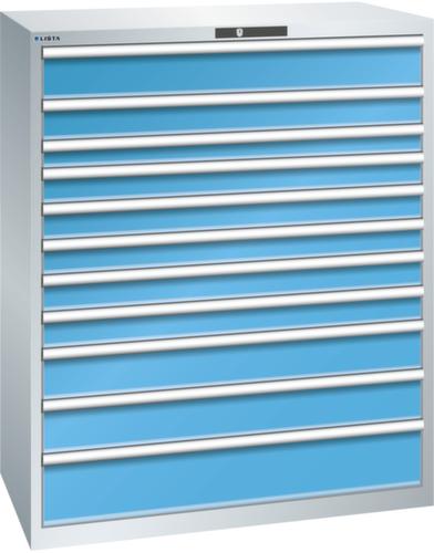"longDescription": "LISTA Schubladenschrank, Lista Einheit: 64x36E, BxTxH: 1193x725x1450mm, Schubladen-Nutzfläche BxT: 1088x612mm, Anzahl Schubladen: 11, Anzahl Fronthöhen (Tragkraft): 1x150mm (200kg), 1x125mm (200kg), 1x75mm (200kg), 5x100mm (200kg), 2x150mm (200kg), 1x200mm (200kg), Schliessart: Key Lock, Standard-Schliessung mit Wechselyzlinder inkl. 2 Schlüsseln mit Schlüsselnummer, Farbe Gehäuse: Lichtgrau RAL 7035, Farbe Schubladen: Lichtblau RAL 5012. Höchste Stabilität: Gehäuse bis 4t belastbar, Schubladen mit 75 oder 200 kg Tragkraft. Maximale Ausnutzung dank Vollauszug und optimaler Mantelhöhe der Schubladen. Exzellente Schutzeigenschaften gegen Schmutz, Flüssigkeiten und mechanische Beanspruchung durch geschlossenes Gehäuse mit schlag- und abriebfester Oberfläche. Überzeugende Sicherheit: Aushebesicherung gegen Herausfallen der Schubladen und Einzelschubladensperre als Kippschutz. Korrosionsschutz durch Elektrophorese-Tauchlackierung und umweltfreundlichen Pulverlack. Optimale Ordnung und Organisation dank speziellem LISTA-Einteilungsmaterial für jeden Zweck und gelochter, geschlitzter Schubladen. Professionelle Beschriftung mit Beschriftungssoftware LISTA Script und hochklappbarer Griffleiste zum Einlegen der Etiketten. Perfekte Laufruhe durch traversenlos geführten Differenzialauszug. Flexible Anpassungsmöglichkeiten durch vorperforierte Löcher für Tischplatten (Punchout), Rollen, Schubladen, Schliesssysteme für einfaches Um- und Nachrüsten<br>",