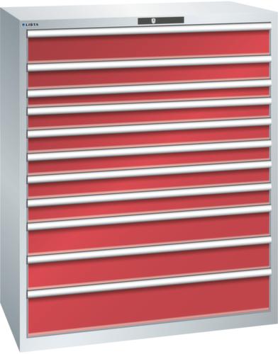 "longDescription": "LISTA Schubladenschrank, Lista Einheit: 64x36E, BxTxH: 1193x725x1450mm, Schubladen-Nutzfläche BxT: 1088x612mm, Anzahl Schubladen: 11, Anzahl Fronthöhen (Tragkraft): 1x150mm (200kg), 1x125mm (200kg), 1x75mm (200kg), 5x100mm (200kg), 2x150mm (200kg), 1x200mm (200kg), Schliessart: Key Lock, Standard-Schliessung mit Wechselyzlinder inkl. 2 Schlüsseln mit Schlüsselnummer, Farbe Gehäuse: Lichtgrau RAL 7035, Farbe Schubladen: Rubinrot RAL 3003. Höchste Stabilität: Gehäuse bis 4t belastbar, Schubladen mit 75 oder 200 kg Tragkraft. Maximale Ausnutzung dank Vollauszug und optimaler Mantelhöhe der Schubladen. Exzellente Schutzeigenschaften gegen Schmutz, Flüssigkeiten und mechanische Beanspruchung durch geschlossenes Gehäuse mit schlag- und abriebfester Oberfläche. Überzeugende Sicherheit: Aushebesicherung gegen Herausfallen der Schubladen und Einzelschubladensperre als Kippschutz. Korrosionsschutz durch Elektrophorese-Tauchlackierung und umweltfreundlichen Pulverlack. Optimale Ordnung und Organisation dank speziellem LISTA-Einteilungsmaterial für jeden Zweck und gelochter, geschlitzter Schubladen. Professionelle Beschriftung mit Beschriftungssoftware LISTA Script und hochklappbarer Griffleiste zum Einlegen der Etiketten. Perfekte Laufruhe durch traversenlos geführten Differenzialauszug. Flexible Anpassungsmöglichkeiten durch vorperforierte Löcher für Tischplatten (Punchout), Rollen, Schubladen, Schliesssysteme für einfaches Um- und Nachrüsten<br>",