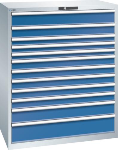 "longDescription": "LISTA Schubladenschrank, Lista Einheit: 64x36E, BxTxH: 1193x725x1450mm, Schubladen-Nutzfläche BxT: 1088x612mm, Anzahl Schubladen: 12, Anzahl Fronthöhen (Tragkraft): 1x150mm (200kg), 1x125mm (200kg), 3x75mm (200kg), 5x100mm (200kg), 1x150mm (200kg), 1x200mm (200kg), Schliessart: Key Lock, Standard-Schliessung mit Wechselyzlinder inkl. 2 Schlüsseln mit Schlüsselnummer, Farbe Gehäuse: Lichtgrau RAL 7035, Farbe Schubladen: Signalblau RAL 5005. Höchste Stabilität: Gehäuse bis 4t belastbar, Schubladen mit 75 oder 200 kg Tragkraft. Maximale Ausnutzung dank Vollauszug und optimaler Mantelhöhe der Schubladen. Exzellente Schutzeigenschaften gegen Schmutz, Flüssigkeiten und mechanische Beanspruchung durch geschlossenes Gehäuse mit schlag- und abriebfester Oberfläche. Überzeugende Sicherheit: Aushebesicherung gegen Herausfallen der Schubladen und Einzelschubladensperre als Kippschutz. Korrosionsschutz durch Elektrophorese-Tauchlackierung und umweltfreundlichen Pulverlack. Optimale Ordnung und Organisation dank speziellem LISTA-Einteilungsmaterial für jeden Zweck und gelochter, geschlitzter Schubladen. Professionelle Beschriftung mit Beschriftungssoftware LISTA Script und hochklappbarer Griffleiste zum Einlegen der Etiketten. Perfekte Laufruhe durch traversenlos geführten Differenzialauszug. Flexible Anpassungsmöglichkeiten durch vorperforierte Löcher für Tischplatten (Punchout), Rollen, Schubladen, Schliesssysteme für einfaches Um- und Nachrüsten<br>",