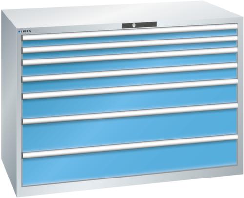 "longDescription": "LISTA Schubladenschrank, Lista Einheit: 78x36E, BxTxH: 1431x725x1000mm, Schubladen-Nutzfläche BxT: 1326x612mm, Anzahl Schubladen: 7, Anzahl Fronthöhen (Tragkraft): 2x75mm (75kg), 2x100mm (75kg), 1x150mm (200kg), 2x200mm (200kg), Schliessart: Key Lock, Standard-Schliessung mit Wechselyzlinder inkl. 2 Schlüsseln mit Schlüsselnummer, Farbe Gehäuse: Lichtgrau RAL 7035, Farbe Schubladen: Lichtblau RAL 5012. Höchste Stabilität: Gehäuse bis 4t belastbar, Schubladen mit 75 oder 200 kg Tragkraft. Maximale Ausnutzung dank Vollauszug und optimaler Mantelhöhe der Schubladen. Exzellente Schutzeigenschaften gegen Schmutz, Flüssigkeiten und mechanische Beanspruchung durch geschlossenes Gehäuse mit schlag- und abriebfester Oberfläche. Überzeugende Sicherheit: Aushebesicherung gegen Herausfallen der Schubladen und Einzelschubladensperre als Kippschutz. Korrosionsschutz durch Elektrophorese-Tauchlackierung und umweltfreundlichen Pulverlack. Optimale Ordnung und Organisation dank speziellem LISTA-Einteilungsmaterial für jeden Zweck und gelochter, geschlitzter Schubladen. Professionelle Beschriftung mit Beschriftungssoftware LISTA Script und hochklappbarer Griffleiste zum Einlegen der Etiketten. Perfekte Laufruhe durch traversenlos geführten Differenzialauszug. Flexible Anpassungsmöglichkeiten durch vorperforierte Löcher für Tischplatten (Punchout), Rollen, Schubladen, Schliesssysteme für einfaches Um- und Nachrüsten<br>",