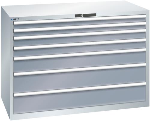 "longDescription": "LISTA Schubladenschrank, Lista Einheit: 78x36E, BxTxH: 1431x725x1000mm, Schubladen-Nutzfläche BxT: 1326x612mm, Anzahl Schubladen: 7, Anzahl Fronthöhen (Tragkraft): 2x75mm (75kg), 2x100mm (75kg), 1x150mm (200kg), 2x200mm (200kg), Schliessart: Code Lock, elektronisches Zahlenschloss mit 10 Ziffern für 4- bis 6-stellige Codes, bis 100 Codes, Farbe Gehäuse: Lichtgrau RAL 7035, Farbe Schubladen: Grau metallic NCS S 6502-B. Höchste Stabilität: Gehäuse bis 4t belastbar, Schubladen mit 75 oder 200 kg Tragkraft. Maximale Ausnutzung dank Vollauszug und optimaler Mantelhöhe der Schubladen. Exzellente Schutzeigenschaften gegen Schmutz, Flüssigkeiten und mechanische Beanspruchung durch geschlossenes Gehäuse mit schlag- und abriebfester Oberfläche. Überzeugende Sicherheit: Aushebesicherung gegen Herausfallen der Schubladen und Einzelschubladensperre als Kippschutz. Korrosionsschutz durch Elektrophorese-Tauchlackierung und umweltfreundlichen Pulverlack. Optimale Ordnung und Organisation dank speziellem LISTA-Einteilungsmaterial für jeden Zweck und gelochter, geschlitzter Schubladen. Professionelle Beschriftung mit Beschriftungssoftware LISTA Script und hochklappbarer Griffleiste zum Einlegen der Etiketten. Perfekte Laufruhe durch traversenlos geführten Differenzialauszug. Flexible Anpassungsmöglichkeiten durch vorperforierte Löcher für Tischplatten (Punchout), Rollen, Schubladen, Schliesssysteme für einfaches Um- und Nachrüsten<br>",