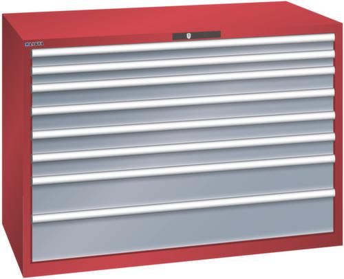 "longDescription": "LISTA Schubladenschrank, Lista Einheit: 78x36E, BxTxH: 1431x725x1000mm, Schubladen-Nutzfläche BxT: 1326x612mm, Anzahl Schubladen: 8, Anzahl Fronthöhen (Tragkraft): 2x75mm (200kg), 4x100mm (200kg), 1x150mm (200kg), 1x200mm (200kg), Schliessart: Code Lock, elektronisches Zahlenschloss mit 10 Ziffern für 4- bis 6-stellige Codes, bis 100 Codes, Farbe Gehäuse: Rubinrot RAL 3003, Farbe Schubladen: Grau metallic NCS S 6502-B. Höchste Stabilität: Gehäuse bis 4t belastbar, Schubladen mit 75 oder 200 kg Tragkraft. Maximale Ausnutzung dank Vollauszug und optimaler Mantelhöhe der Schubladen. Exzellente Schutzeigenschaften gegen Schmutz, Flüssigkeiten und mechanische Beanspruchung durch geschlossenes Gehäuse mit schlag- und abriebfester Oberfläche. Überzeugende Sicherheit: Aushebesicherung gegen Herausfallen der Schubladen und Einzelschubladensperre als Kippschutz. Korrosionsschutz durch Elektrophorese-Tauchlackierung und umweltfreundlichen Pulverlack. Optimale Ordnung und Organisation dank speziellem LISTA-Einteilungsmaterial für jeden Zweck und gelochter, geschlitzter Schubladen. Professionelle Beschriftung mit Beschriftungssoftware LISTA Script und hochklappbarer Griffleiste zum Einlegen der Etiketten. Perfekte Laufruhe durch traversenlos geführten Differenzialauszug. Flexible Anpassungsmöglichkeiten durch vorperforierte Löcher für Tischplatten (Punchout), Rollen, Schubladen, Schliesssysteme für einfaches Um- und Nachrüsten<br>",