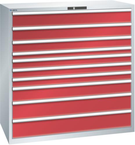 "longDescription": "LISTA Schubladenschrank, Lista Einheit: 78x36E, BxTxH: 1431x725x1450mm, Schubladen-Nutzfläche BxT: 1326x612mm, Anzahl Schubladen: 10, Anzahl Fronthöhen (Tragkraft): 2x150mm (200kg), 1x125mm (200kg), 1x75mm (200kg), 3x100mm (200kg), 1x150mm (200kg), 2x200mm (200kg), Schliessart: Code Lock, elektronisches Zahlenschloss mit 10 Ziffern für 4- bis 6-stellige Codes, bis 100 Codes, Farbe Gehäuse: Lichtgrau RAL 7035, Farbe Schubladen: Rubinrot RAL 3003. Höchste Stabilität: Gehäuse bis 4t belastbar, Schubladen mit 75 oder 200 kg Tragkraft. Maximale Ausnutzung dank Vollauszug und optimaler Mantelhöhe der Schubladen. Exzellente Schutzeigenschaften gegen Schmutz, Flüssigkeiten und mechanische Beanspruchung durch geschlossenes Gehäuse mit schlag- und abriebfester Oberfläche. Überzeugende Sicherheit: Aushebesicherung gegen Herausfallen der Schubladen und Einzelschubladensperre als Kippschutz. Korrosionsschutz durch Elektrophorese-Tauchlackierung und umweltfreundlichen Pulverlack. Optimale Ordnung und Organisation dank speziellem LISTA-Einteilungsmaterial für jeden Zweck und gelochter, geschlitzter Schubladen. Professionelle Beschriftung mit Beschriftungssoftware LISTA Script und hochklappbarer Griffleiste zum Einlegen der Etiketten. Perfekte Laufruhe durch traversenlos geführten Differenzialauszug. Flexible Anpassungsmöglichkeiten durch vorperforierte Löcher für Tischplatten (Punchout), Rollen, Schubladen, Schliesssysteme für einfaches Um- und Nachrüsten<br>",