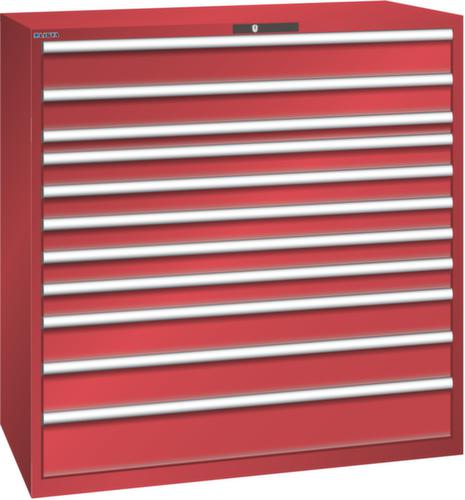 "longDescription": "LISTA Schubladenschrank, Lista Einheit: 78x36E, BxTxH: 1431x725x1450mm, Schubladen-Nutzfläche BxT: 1326x612mm, Anzahl Schubladen: 11, Anzahl Fronthöhen (Tragkraft): 1x150mm (200kg), 1x125mm (200kg), 1x75mm (200kg), 5x100mm (200kg), 2x150mm (200kg), 1x200mm (200kg), Schliessart: Code Lock, elektronisches Zahlenschloss mit 10 Ziffern für 4- bis 6-stellige Codes, bis 100 Codes, Farbe Gehäuse: Rubinrot RAL 3003, Farbe Schubladen: Grau metallic NCS S 6502-B. Höchste Stabilität: Gehäuse bis 4t belastbar, Schubladen mit 75 oder 200 kg Tragkraft. Maximale Ausnutzung dank Vollauszug und optimaler Mantelhöhe der Schubladen. Exzellente Schutzeigenschaften gegen Schmutz, Flüssigkeiten und mechanische Beanspruchung durch geschlossenes Gehäuse mit schlag- und abriebfester Oberfläche. Überzeugende Sicherheit: Aushebesicherung gegen Herausfallen der Schubladen und Einzelschubladensperre als Kippschutz. Korrosionsschutz durch Elektrophorese-Tauchlackierung und umweltfreundlichen Pulverlack. Optimale Ordnung und Organisation dank speziellem LISTA-Einteilungsmaterial für jeden Zweck und gelochter, geschlitzter Schubladen. Professionelle Beschriftung mit Beschriftungssoftware LISTA Script und hochklappbarer Griffleiste zum Einlegen der Etiketten. Perfekte Laufruhe durch traversenlos geführten Differenzialauszug. Flexible Anpassungsmöglichkeiten durch vorperforierte Löcher für Tischplatten (Punchout), Rollen, Schubladen, Schliesssysteme für einfaches Um- und Nachrüsten<br>",