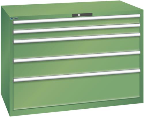 "longDescription": "LISTA Schubladenschrank, Lista Einheit: 78x36E, BxTxH: 1431x725x1000mm, Schubladen-Nutzfläche BxT: 1326x612mm, Anzahl Schubladen: 5, Anzahl Fronthöhen (Tragkraft): 2x100mm (75kg), 2x200mm (200kg), 1x300mm (200kg), Schliessart: Code Lock, elektronisches Zahlenschloss mit 10 Ziffern für 4- bis 6-stellige Codes, bis 100 Codes, Farbe Gehäuse: Resedagrün RAL 6011, Farbe Schubladen: Resedagrün RAL 6011. Höchste Stabilität: Gehäuse bis 4t belastbar, Schubladen mit 75 oder 200 kg Tragkraft. Maximale Ausnutzung dank Vollauszug und optimaler Mantelhöhe der Schubladen. Exzellente Schutzeigenschaften gegen Schmutz, Flüssigkeiten und mechanische Beanspruchung durch geschlossenes Gehäuse mit schlag- und abriebfester Oberfläche. Überzeugende Sicherheit: Aushebesicherung gegen Herausfallen der Schubladen und Einzelschubladensperre als Kippschutz. Korrosionsschutz durch Elektrophorese-Tauchlackierung und umweltfreundlichen Pulverlack. Optimale Ordnung und Organisation dank speziellem LISTA-Einteilungsmaterial für jeden Zweck und gelochter, geschlitzter Schubladen. Professionelle Beschriftung mit Beschriftungssoftware LISTA Script und hochklappbarer Griffleiste zum Einlegen der Etiketten. Perfekte Laufruhe durch traversenlos geführten Differenzialauszug. Flexible Anpassungsmöglichkeiten durch vorperforierte Löcher für Tischplatten (Punchout), Rollen, Schubladen, Schliesssysteme für einfaches Um- und Nachrüsten<br>",