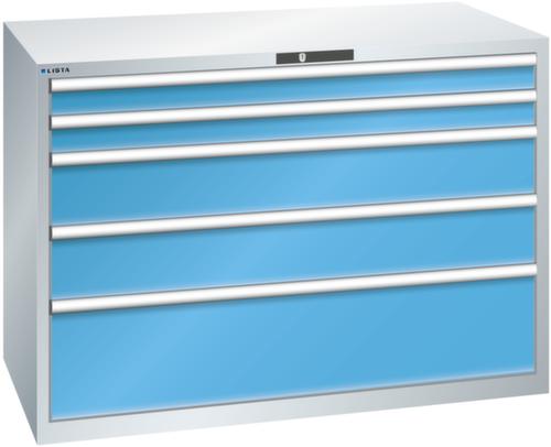 "longDescription": "LISTA Schubladenschrank, Lista Einheit: 78x36E, BxTxH: 1431x725x1000mm, Schubladen-Nutzfläche BxT: 1326x612mm, Anzahl Schubladen: 5, Anzahl Fronthöhen (Tragkraft): 2x100mm (75kg), 2x200mm (200kg), 1x300mm (200kg), Schliessart: Code Lock, elektronisches Zahlenschloss mit 10 Ziffern für 4- bis 6-stellige Codes, bis 100 Codes, Farbe Gehäuse: Lichtgrau RAL 7035, Farbe Schubladen: Lichtblau RAL 5012. Höchste Stabilität: Gehäuse bis 4t belastbar, Schubladen mit 75 oder 200 kg Tragkraft. Maximale Ausnutzung dank Vollauszug und optimaler Mantelhöhe der Schubladen. Exzellente Schutzeigenschaften gegen Schmutz, Flüssigkeiten und mechanische Beanspruchung durch geschlossenes Gehäuse mit schlag- und abriebfester Oberfläche. Überzeugende Sicherheit: Aushebesicherung gegen Herausfallen der Schubladen und Einzelschubladensperre als Kippschutz. Korrosionsschutz durch Elektrophorese-Tauchlackierung und umweltfreundlichen Pulverlack. Optimale Ordnung und Organisation dank speziellem LISTA-Einteilungsmaterial für jeden Zweck und gelochter, geschlitzter Schubladen. Professionelle Beschriftung mit Beschriftungssoftware LISTA Script und hochklappbarer Griffleiste zum Einlegen der Etiketten. Perfekte Laufruhe durch traversenlos geführten Differenzialauszug. Flexible Anpassungsmöglichkeiten durch vorperforierte Löcher für Tischplatten (Punchout), Rollen, Schubladen, Schliesssysteme für einfaches Um- und Nachrüsten<br>",