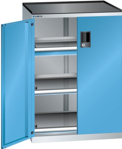 "longDescription": "LISTA Schubladenschrank mit Flügeltüren, Lista Einheit: 36x27E, BxTxH: 717x600x1020mm, Schubladen-Nutzfläche BxT: 612x459mm, Anzahl Schubladen: 1x75mm (75kg), Anzahl Auszugböden: 2x75mm (75kg), Schliessart: Key Lock, Standard-Schliessung mit Wechselzylinder inkl. 2 Schlüsseln mit Schlüsselnummer, Ausstattung: Abrollrand 3-seitig, 20mm hoch, inklusive Rillenmatte, Farbe Gehäuse: Lichtgrau RAL 7035, Farbe Türen/Schubladen: Lichtblau RAL 5012. Allgemeine Vorteile der LISTA Schubladenschränke. Ideal für grosses und schweres Lagergut bis 200 kg pro Schublade mit Auszugböden zur flächenbündigen Lagerung. Jederzeit anpassbar an neues Lagergut durch den flexiblen Ein- und Umbau von Schubladen, Auszugböden und Verstellböden im 25-mm-Raster. Einfaches Versetzen mittels Hubwagen dank Staplersockel auch bei beladenem Schrank<br>",