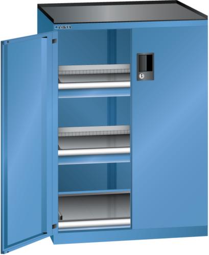 "longDescription": "LISTA Schubladenschrank mit Flügeltüren, Lista Einheit: 36x27E, BxTxH: 717x600x1020mm, Schubladen-Nutzfläche BxT: 612x459mm, Anzahl Schubladen: 2x75mm (75kg), Anzahl Auszugböden: 1x75mm (75kg), Schliessart: Code Lock, elektronisches Zahlenschloss mit 10 Ziffern für 4- bis 6-stellige Codes, bis 100 Codes, Ausstattung: Abrollrand 3-seitig, 20mm hoch, inklusive Rillenmatte, Farbe Gehäuse: Capriblau RAL 5019, Farbe Türen/Schubladen: Capriblau RAL 5019. Allgemeine Vorteile der LISTA Schubladenschränke. Ideal für grosses und schweres Lagergut bis 200 kg pro Schublade mit Auszugböden zur flächenbündigen Lagerung. Jederzeit anpassbar an neues Lagergut durch den flexiblen Ein- und Umbau von Schubladen, Auszugböden und Verstellböden im 25-mm-Raster. Einfaches Versetzen mittels Hubwagen dank Staplersockel auch bei beladenem Schrank<br>",
