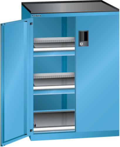 "longDescription": "LISTA Schubladenschrank mit Flügeltüren, Lista Einheit: 36x27E, BxTxH: 717x600x1020mm, Schubladen-Nutzfläche BxT: 612x459mm, Anzahl Schubladen: 2x75mm (200kg), Anzahl Auszugböden: 1x75mm (200kg), Schliessart: Code Lock, elektronisches Zahlenschloss mit 10 Ziffern für 4- bis 6-stellige Codes, bis 100 Codes, Ausstattung: Abrollrand 3-seitig, 20mm hoch, inklusive Rillenmatte, Farbe Gehäuse: Lichtblau RAL 5012, Farbe Türen/Schubladen: Lichtblau RAL 5012. Allgemeine Vorteile der LISTA Schubladenschränke. Ideal für grosses und schweres Lagergut bis 200 kg pro Schublade mit Auszugböden zur flächenbündigen Lagerung. Jederzeit anpassbar an neues Lagergut durch den flexiblen Ein- und Umbau von Schubladen, Auszugböden und Verstellböden im 25-mm-Raster. Einfaches Versetzen mittels Hubwagen dank Staplersockel auch bei beladenem Schrank<br>",