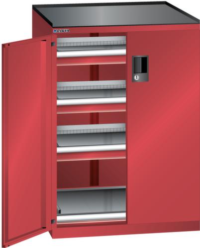 "longDescription": "LISTA Schubladenschrank mit Flügeltüren, Lista Einheit: 36x27E, BxTxH: 717x600x1020mm, Schubladen-Nutzfläche BxT: 612x459mm, Anzahl Schubladen: 3x75mm (75kg), Anzahl Auszugböden: 1x75mm (75kg), Schliessart: Code Lock, elektronisches Zahlenschloss mit 10 Ziffern für 4- bis 6-stellige Codes, bis 100 Codes, Ausstattung: Abrollrand 3-seitig, 20mm hoch, inklusive Rillenmatte, Farbe Gehäuse: Rubinrot RAL 3003, Farbe Türen/Schubladen: Rubinrot RAL 3003. Allgemeine Vorteile der LISTA Schubladenschränke. Ideal für grosses und schweres Lagergut bis 200 kg pro Schublade mit Auszugböden zur flächenbündigen Lagerung. Jederzeit anpassbar an neues Lagergut durch den flexiblen Ein- und Umbau von Schubladen, Auszugböden und Verstellböden im 25-mm-Raster. Einfaches Versetzen mittels Hubwagen dank Staplersockel auch bei beladenem Schrank<br>",