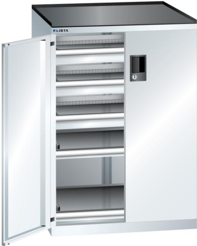 "longDescription": "LISTA Schubladenschrank mit Flügeltüren, Lista Einheit: 36x27E, BxTxH: 717x600x1020mm, Schubladen-Nutzfläche BxT: 612x459mm, Anzahl Schubladen: 3x75mm (200kg), Anzahl Auszugböden: 2x75mm (200kg), Schliessart: Code Lock, elektronisches Zahlenschloss mit 10 Ziffern für 4- bis 6-stellige Codes, bis 100 Codes, Ausstattung: Abrollrand 3-seitig, 20mm hoch, inklusive Rillenmatte, Farbe Gehäuse: Reinweiss RAL 9010, Farbe Türen/Schubladen: Reinweiss RAL 9010. Allgemeine Vorteile der LISTA Schubladenschränke. Ideal für grosses und schweres Lagergut bis 200 kg pro Schublade mit Auszugböden zur flächenbündigen Lagerung. Jederzeit anpassbar an neues Lagergut durch den flexiblen Ein- und Umbau von Schubladen, Auszugböden und Verstellböden im 25-mm-Raster. Einfaches Versetzen mittels Hubwagen dank Staplersockel auch bei beladenem Schrank<br>",